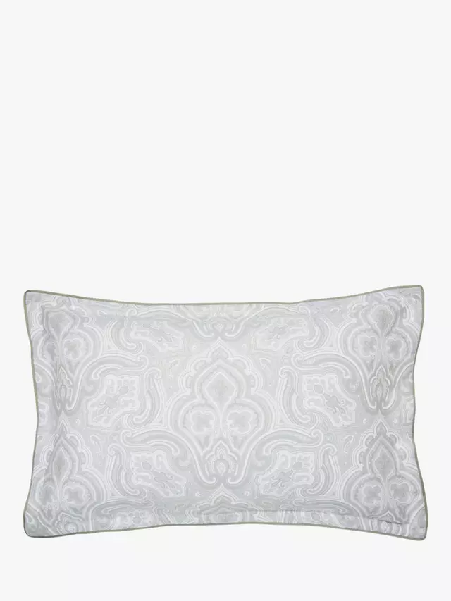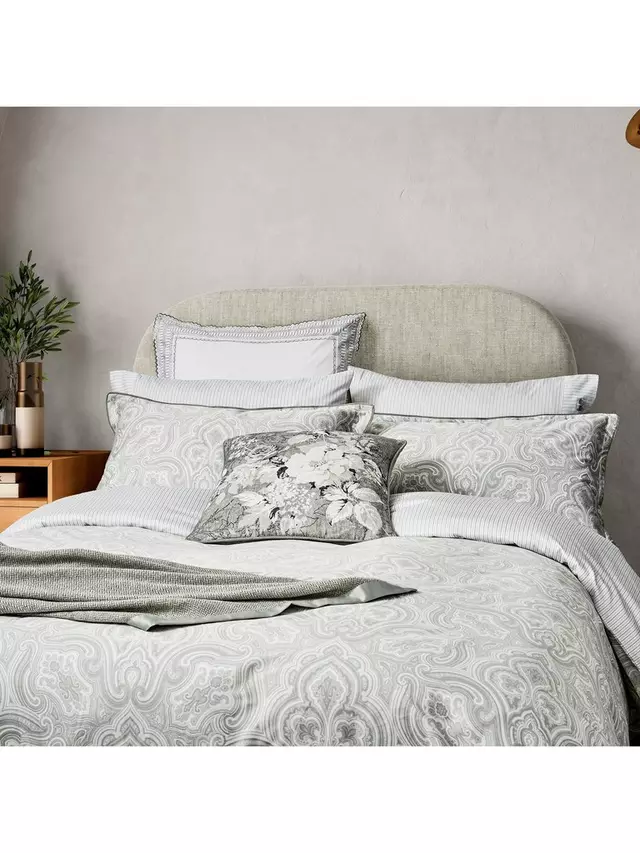 Amalia представляет собой замысловатый узор пейсли по всей поверхности в нежном серебристом и белом цветах с нежной полосатой изнанкой. Прекрасно роскошный из 100% хлопкового сатина плотностью 220 нитей. В один комплект входит 1 наволочка Oxford. Все остальные комплекты содержат 2 наволочки Oxford.