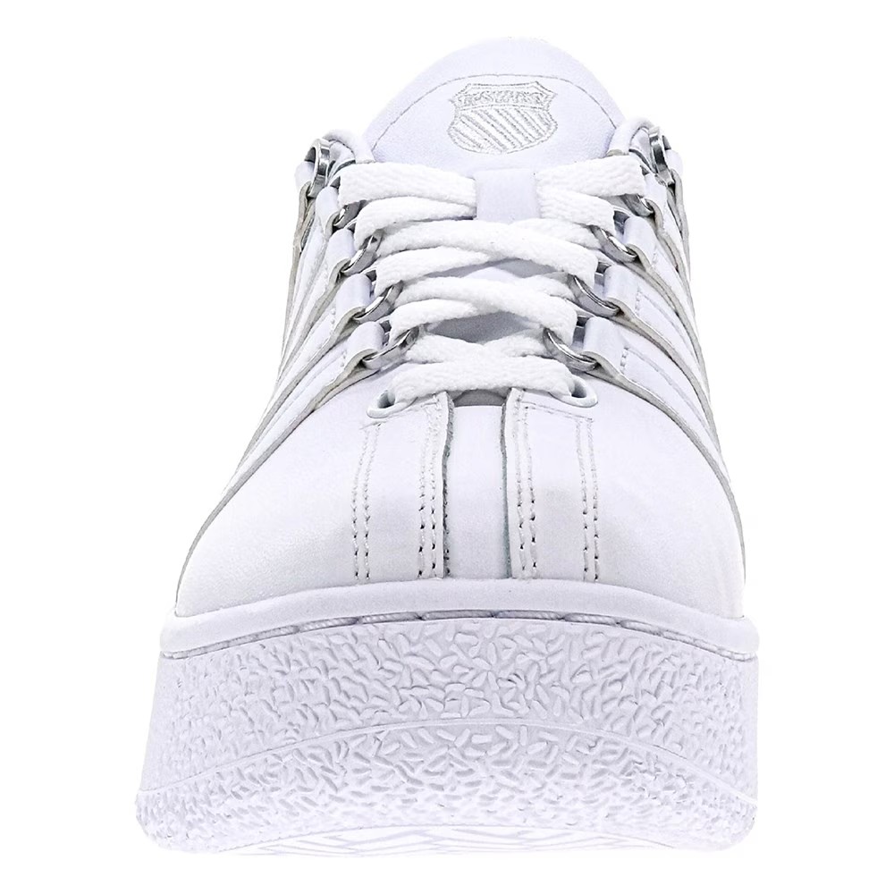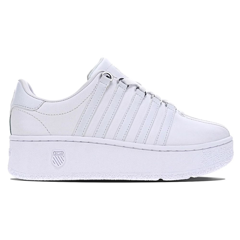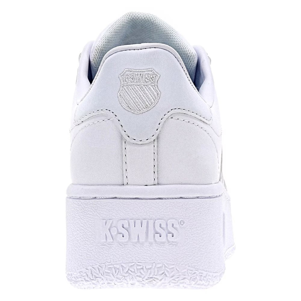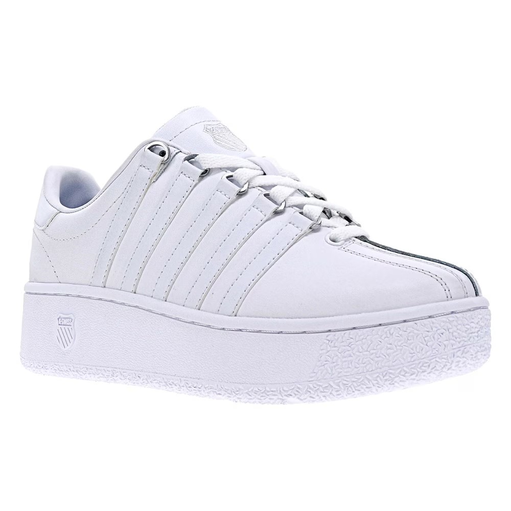 Женские кроссовки K-Swiss Classic VN Platform Sneaker Кожаный верх в стиле кроссовок с круглым носком Трехкомпонентный носок Шнуровка спереди с D-образными люверсами Деталь с пятью полосками Отделка строчкой Мягкий язычок и воротник Вышитый логотип на язычке и пятке Гладкая подкладка с мягкой стелькой Формованная резиновая подошва на платформе, не оставляющая следов