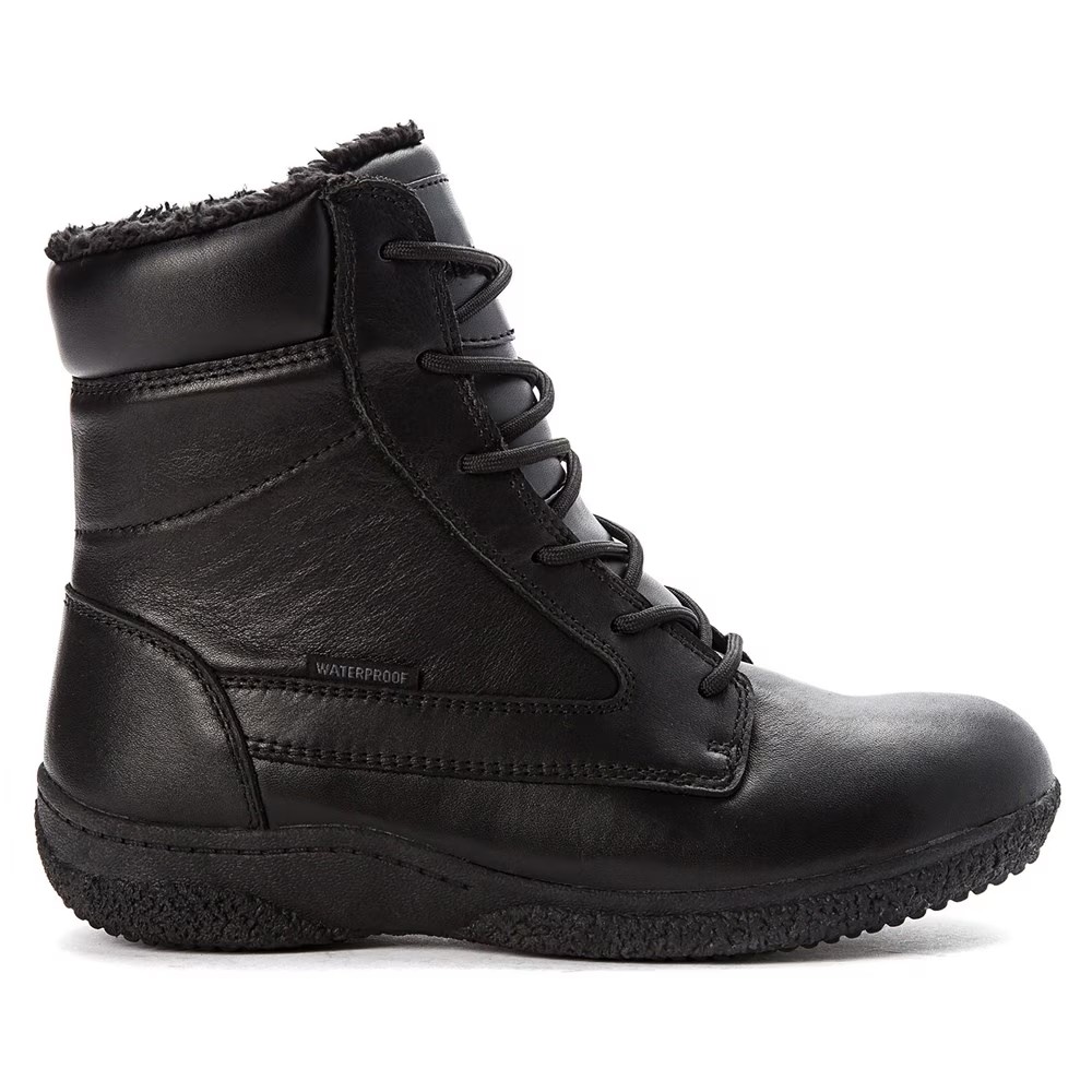 A5500 Medicare Eligible Верх из обработанной скотчгардом кожи в стиле водонепроницаемых зимних ботинок с круглым носком Внутренняя молния со шнуровкой для дополнительной регулировки Подкладка из искусственного меха с низким ворсом Двойные стельки Vaporex для дополнительной изоляции Высота ботинка 6 дюймов Прочная подошва из термопластичной резины с каблуком 1 и 1/4 дюйма