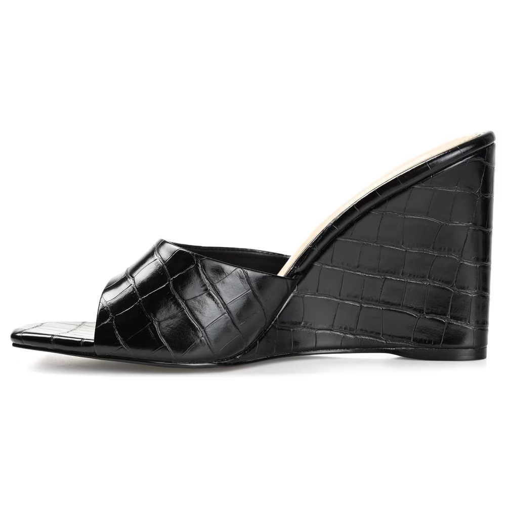 Удобные каблуки, которые вы так долго ждали, встречайте женские босоножки на танкетке Vivvy из коллекции Journee. Верх из искусственной кожи в стиле босоножек на танкетке с открытым носком Без застежки Детали с текстурой под крокодила Гладкая подкладка со стелькой Tru Comfort Foam толщиной 4 мм 100% веганский продукт Прочная искусственная подошва Каблук-танкетка 4 дюйма