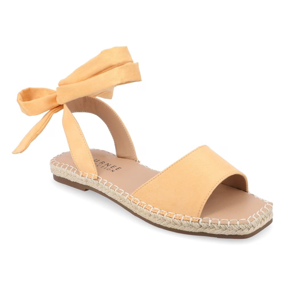 Сандалии Emelie из женской коллекции Journee привносят совершенно новое значение слову «сандалии». Верх из веганской замши в плоском стиле сандалий с открытым носком. Завязка на щиколотке в стиле балеток. Гладкая подкладка со стелькой Tru Comfort Foam толщиной 4 мм. Отделка обметочным стежком на стельке. Плетеные эспадрильи на подошве. Прочная искусственная подошва.