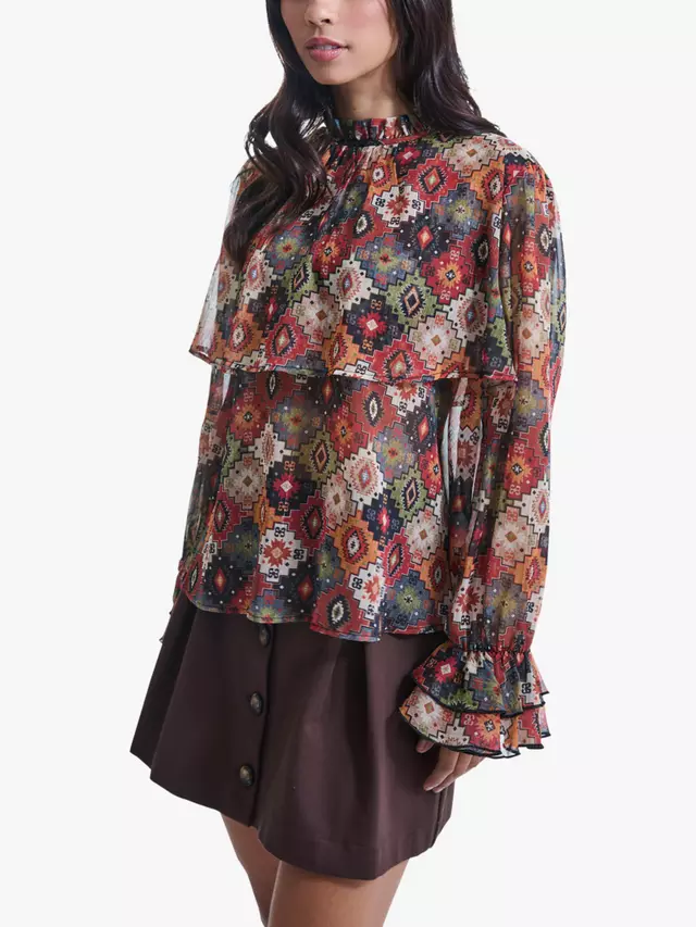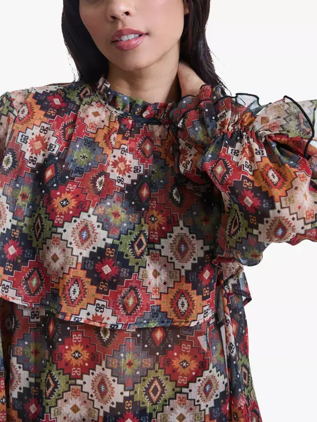 Добавьте немного винтажного очарования в свой гардероб с этой оригинальной блузкой с принтом от James Lakeland. Изготовленная из прозрачного шифона с золотой нитью, она имеет принт в стиле 70-х. Длинные рукава заканчиваются рюшами, двухъярусными манжетами с оборками, а струящаяся панель украшает грудь и спину. Элегантный воротник с оборками застегивается сзади на одну пуговицу, что делает ее выдающейся вещью для любого случая.