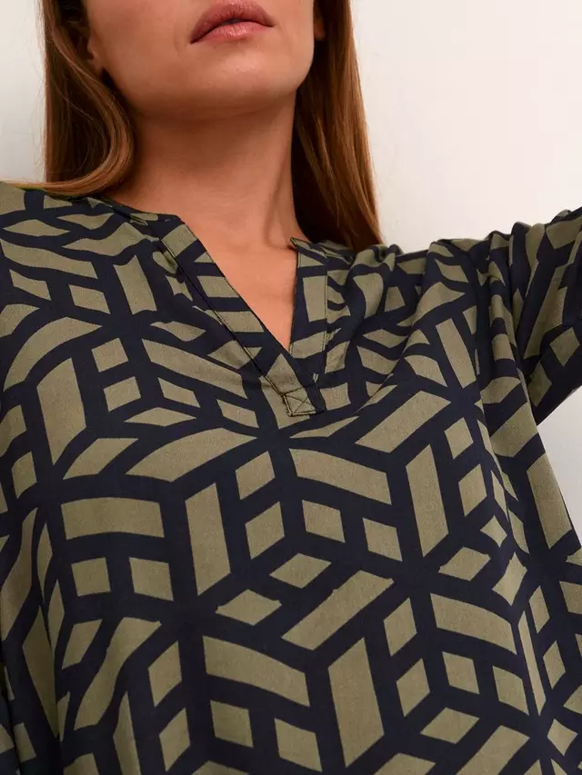 Бренд: KAFFE Состав: 100% вискоза LENZING ECOVERO Страна происхождения: Индия Тип манжеты: пуговицы Инструкции по сушке: не сушить в стиральной машине, сушить на веревке Застежка: пуговицы Гладить: гладить при макс. температуре 150 °C Вырез: V-образный Детали узора: геометрический Инструкции по стирке: не использовать отбеливатель, машинная стирка при 30 °C