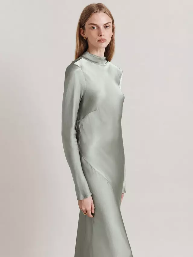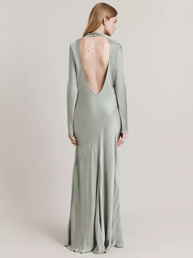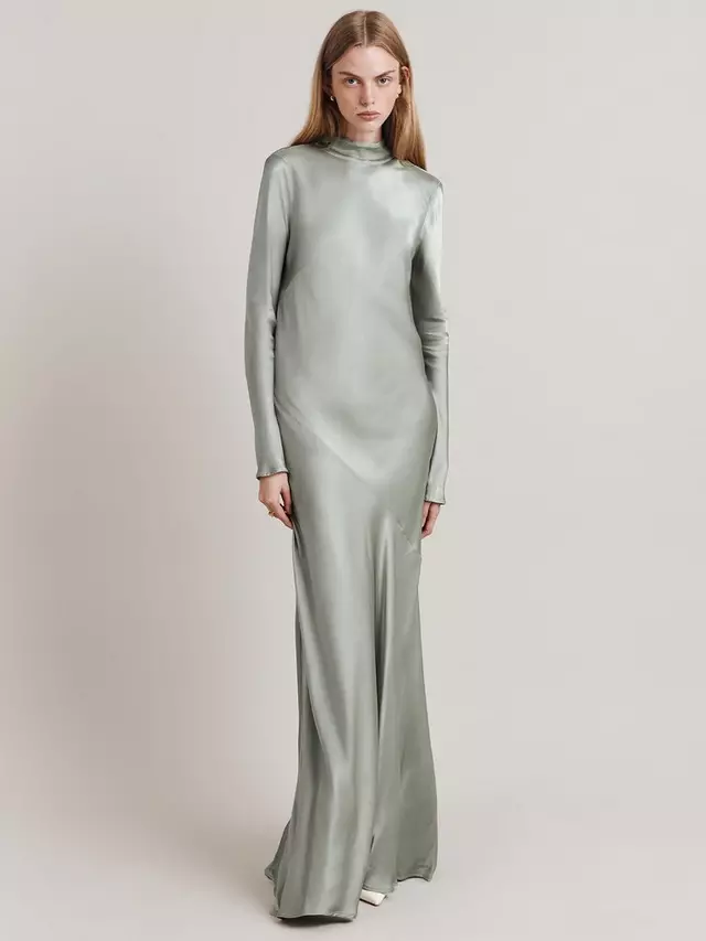 Продающий текст: Для высокооктанового гламура не ищите ничего, кроме Rayna. Это красивое драматическое платье в пол с длинными узкими рукавами, высоким воротником, который застегивается сзади на шее двумя обтянутыми пуговицами, и широким глубоким вырезом на спине. Косой крой с диагональными швами спереди и сзади юбки для элегантного движения. Яркая вещь, которую вы будете беречь вечно.