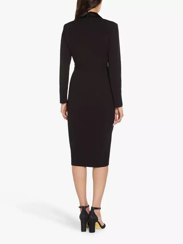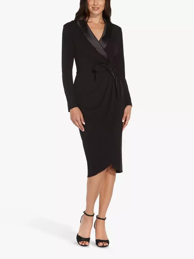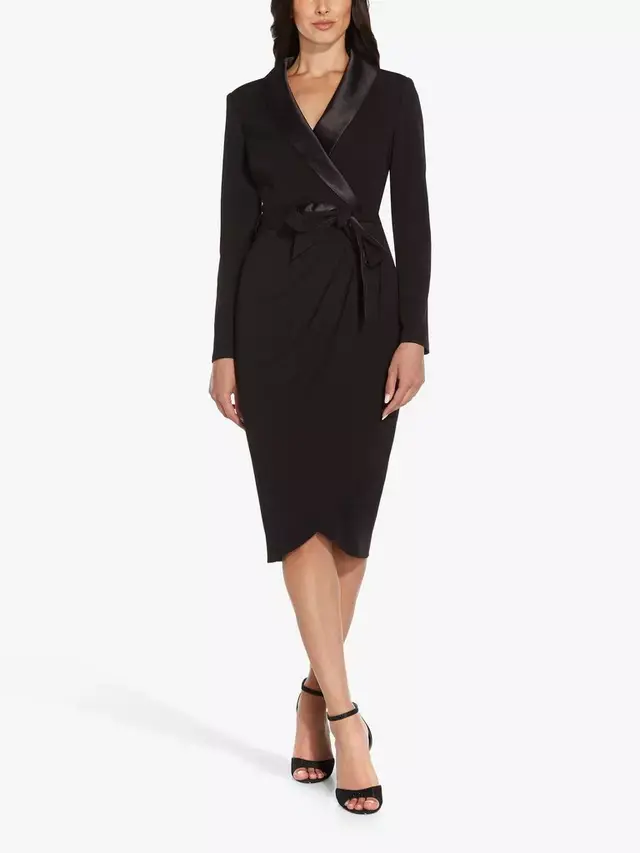 Это платье длиной до колена от Adrianna Papell с изысканным запахом спереди и асимметричным подолом дополняется узорчатыми аксессуарами. Благодаря привлекательному атласному воротнику, защипу на талии и длинным рукавам оно прекрасно сочетается с элегантными туфлями-лодочками, создавая изысканный образ, который позволит вам легко отправиться и в зал заседаний, и в бар.