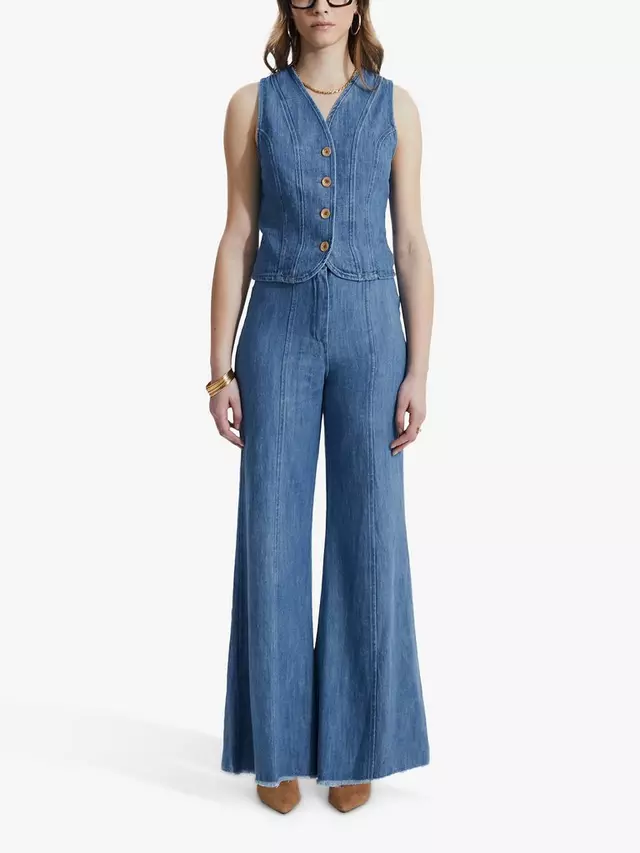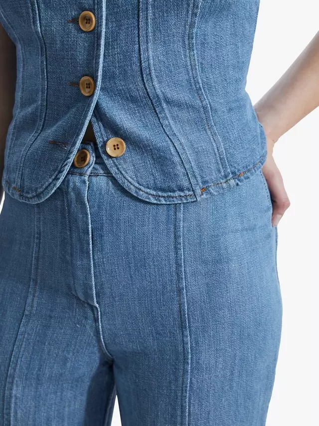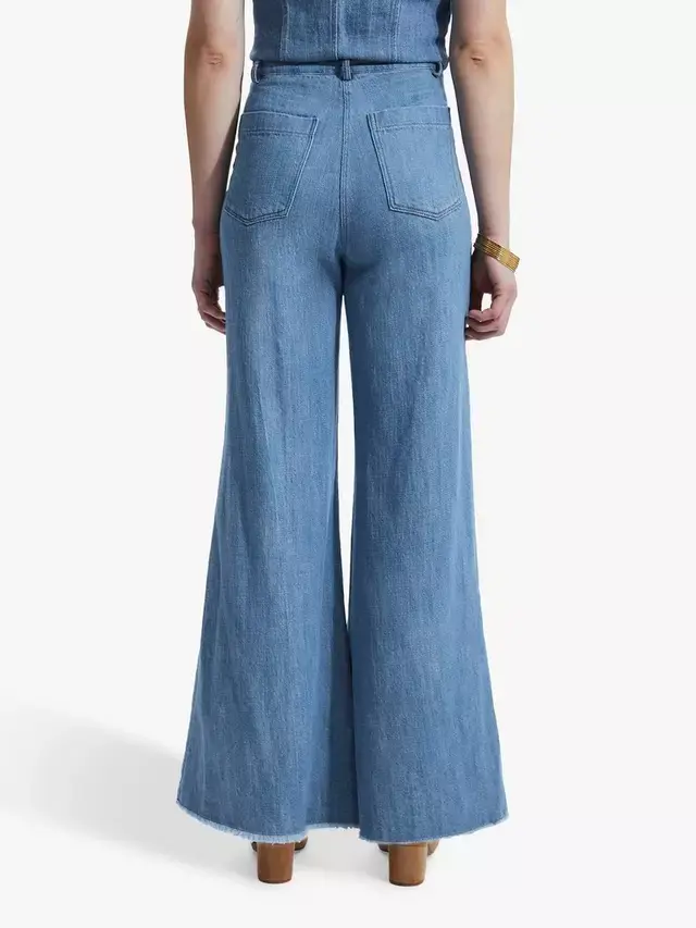 Эти слегка расклешенные джинсы — идеальный вариант для весенней коллекции James Lakeland. Эти брюки из денима с высокой талией, отстрочкой спереди и необработанными нижними краями, имеют поясные кольца и застегиваются на классическую пуговицу и молнию. Сочетайте их с легкой блузкой для сдержанного, но элегантного образа.