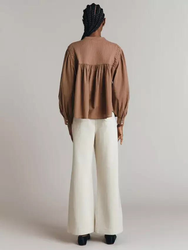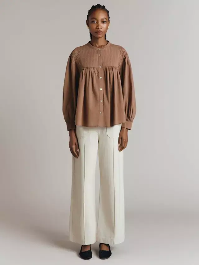 Обновите свой гардероб с помощью Greta, хлопковой поплиновой блузки с классическим, непринужденным стилем. Богатая деталями, эта модель имеет передний нагрудник со сложным жаккардовым узором, плиссировку на плечах, легкий объем на рукавах и пуговицы-ракушки. Попробуйте заправить ее в брюки с высокой талией или джинсы для легкого осеннего образа.