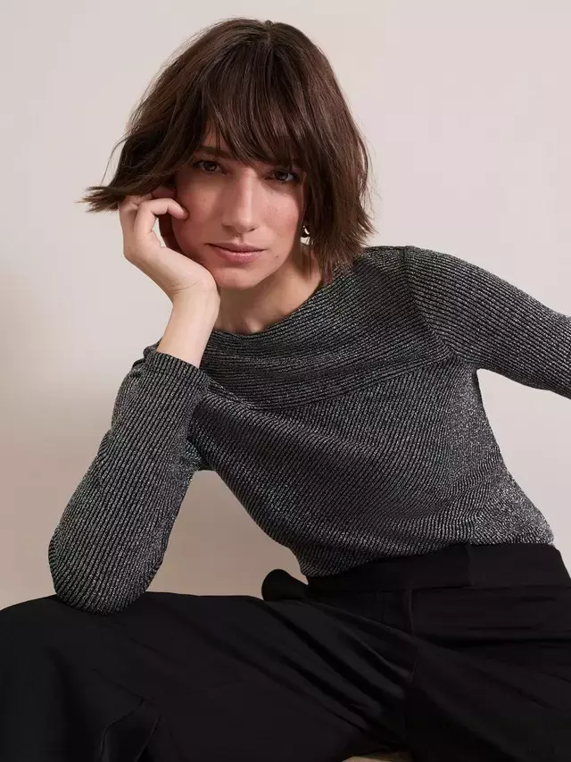 Топ Clarissa с отделкой металлической нитью отличается женственным косым вырезом и отделкой швами. С длинными рукавами и ребристой текстурой по всему верху — идеальный стиль, чтобы добавить изысканного блеска вашим любимым нарядам.