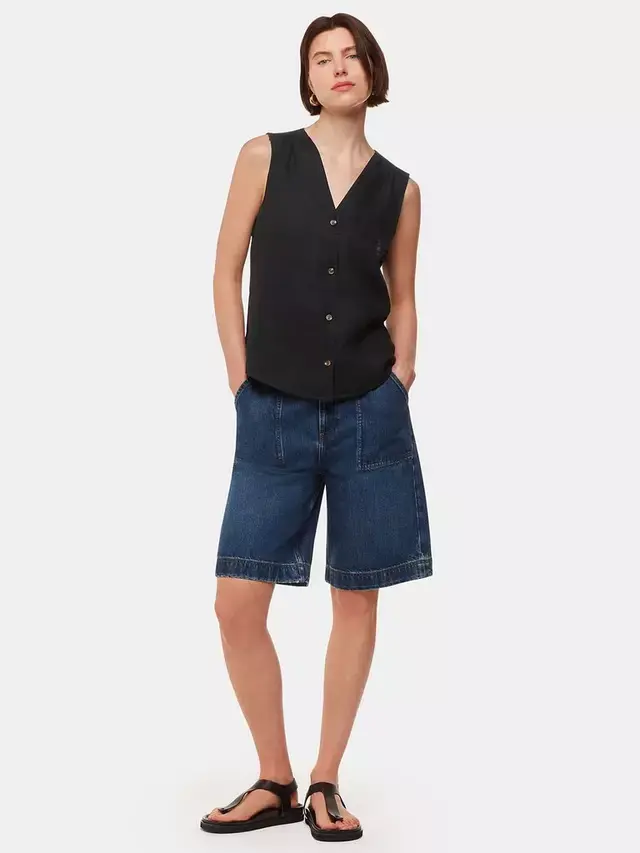 Блузка с классическим V-образным вырезом и без рукавов выполнена из льна, что обеспечивает комфорт в теплую погоду и идеально подходит для непринужденного дневного ношения.