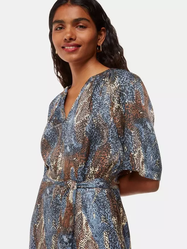 Это миниатюрное платье средней длины от Whistles, полностью подчеркивающее фигуру благодаря своему А-образному силуэту, выполнено из вискозы, которую любят за ее невесомость. С универсальным V-образным вырезом и короткими рукавами этот стиль громко заявляет о себе своим штриховым змеиным принтом.