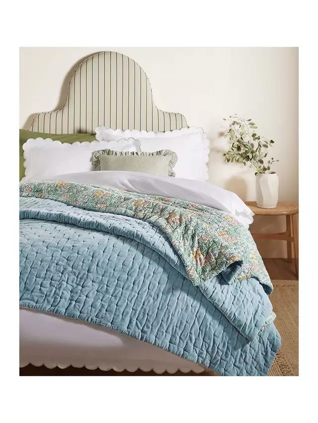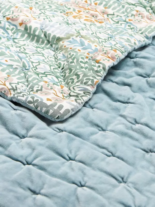 Это стеганое хлопковое покрывало имеет довольно абстрактный цветочный рисунок, переходящий в однотонный небесно-голубой цвет, что дает вам возможность создать свежий и летний образ для вашей спальни.