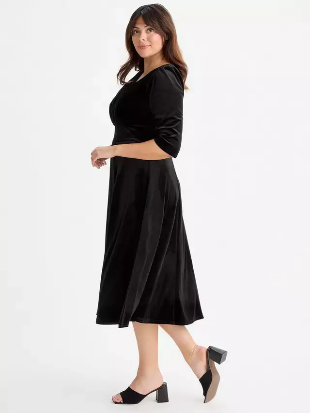 Это платье средней длины от Scarlett & Jo, созданное для облегания и расклешения, выполнено из мягкой бархатной смеси. С универсальным V-образным вырезом и рукавами длиной три четверти оно позволяет вам продемонстрировать свою универсальность.