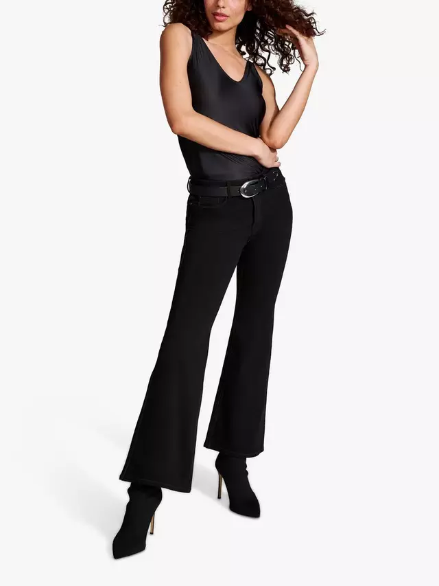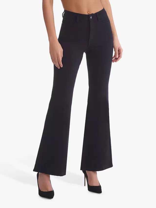 Эти расклешенные джинсы с высокой посадкой выполнены из прочной черной хлопковой джинсовой смеси. Посадка и отделка идеально подчеркивают вашу фигуру и создают идеальный силуэт. Сочетайте с ребристым жилетом для простого образа на выходные.