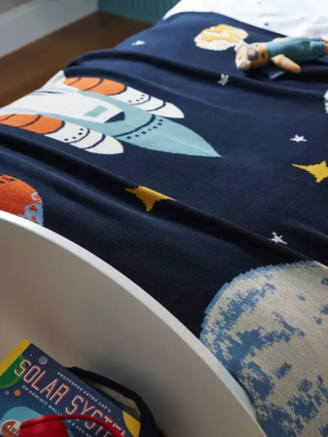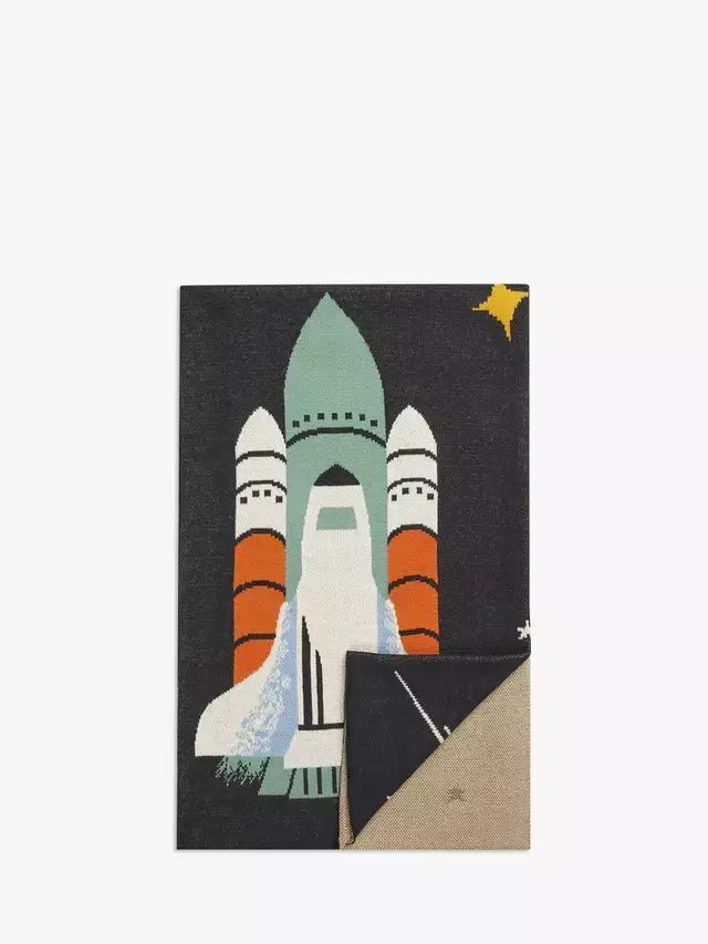 Подпитывайте их увлечение космосом с помощью этого пледа с принтом ракеты. Сделанный из чистого хлопка для мягкого прикосновения, он станет идеальным завершающим штрихом для любой комнаты в космической тематике.