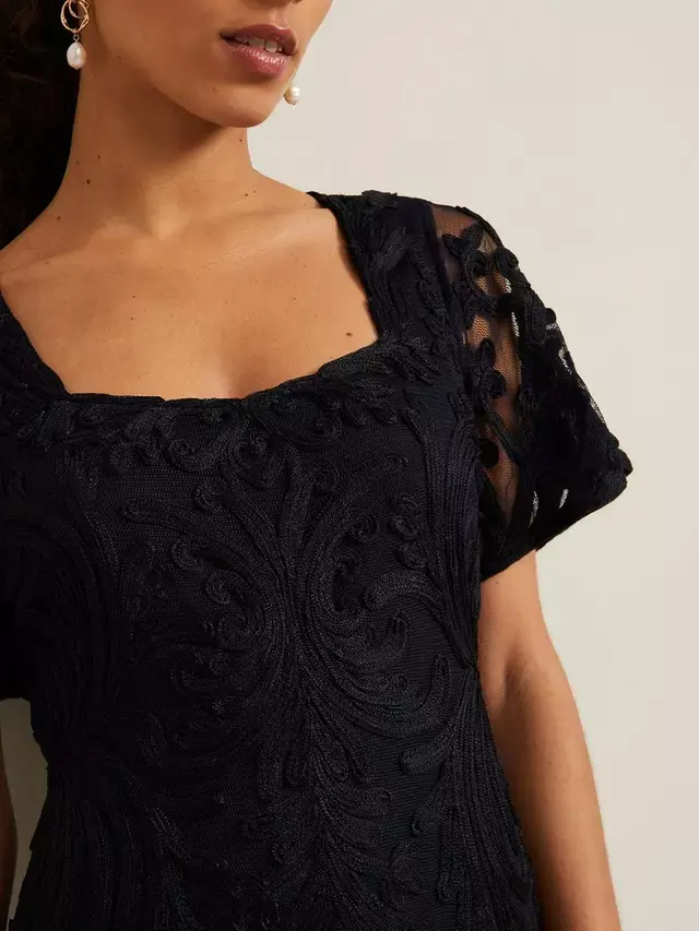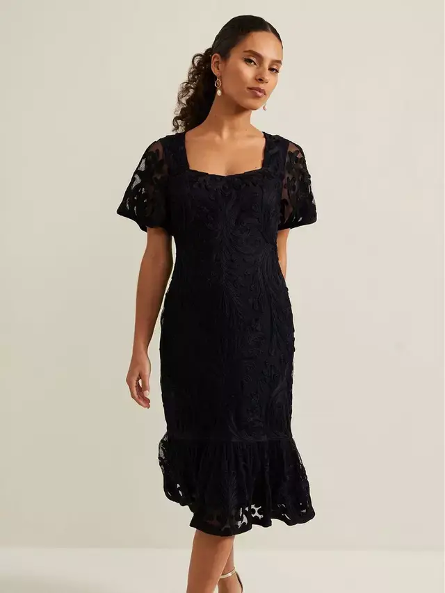 Это платье средней длины от Phase Eight, расклешенное к удлиненному подолу «рыбий хвост», выполнено из прочной ткани. Современный квадратный вырез и короткие рукава, этот стиль украшен прозрачным кружевом.