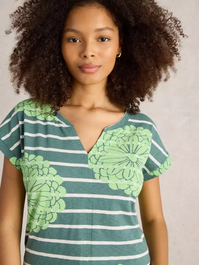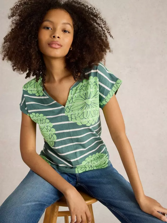 Дополнившая твою повседневную коллекцию футболка с полосатым цветочным принтом от White Stuff имеет классический V-образный вырез, короткие рукава и изготовлена из чистого органического хлопка.