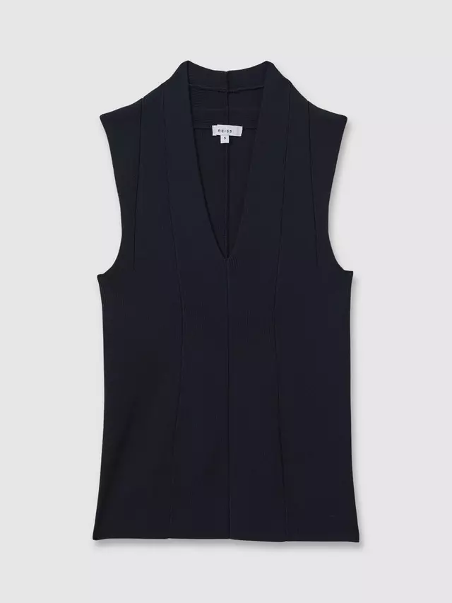 Этот трикотажный топ от Reiss с V-образным вырезом визуально удлиняет фигуру и выполнен из легкой смесовой ткани, обеспечивающей гладкую поверхность.