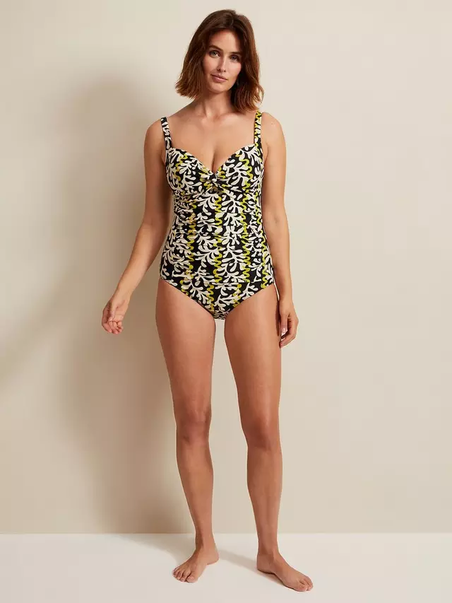 Купальный костюм от Phase Eight с абстрактным принтом, который действительно шокирует, имеет вырез сердечком, формованные чашки и квадратную спинку.