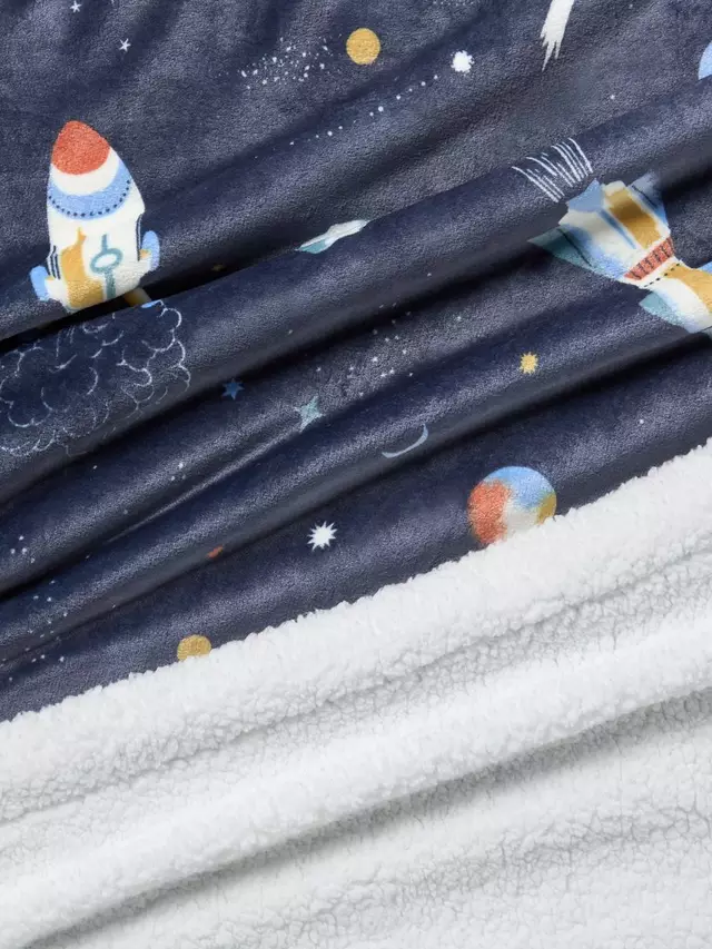 Почувствуйте уют с этим одеялом, спереди украшенным принтом с изображением космоса, а сзади — мягким на ощупь флисом.