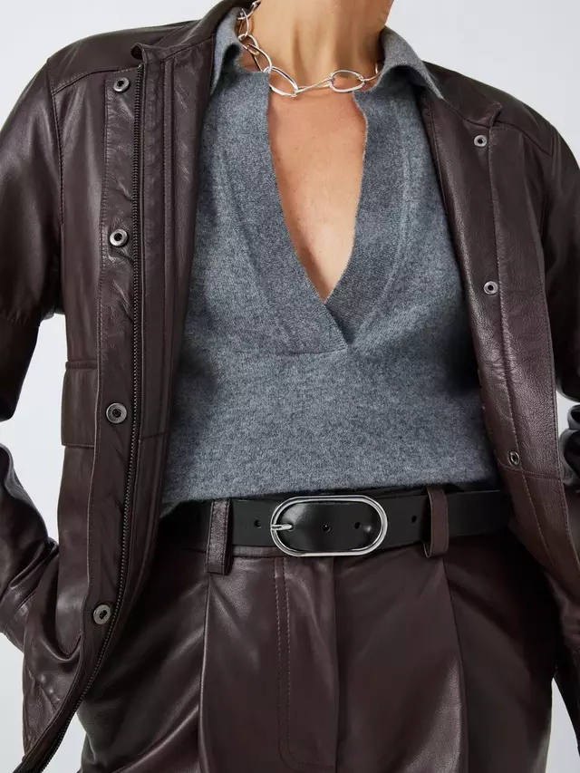 Простой и стильный ремень с тонкой серебряной пряжкой овальной формы, который добавит изюминку любому образу.