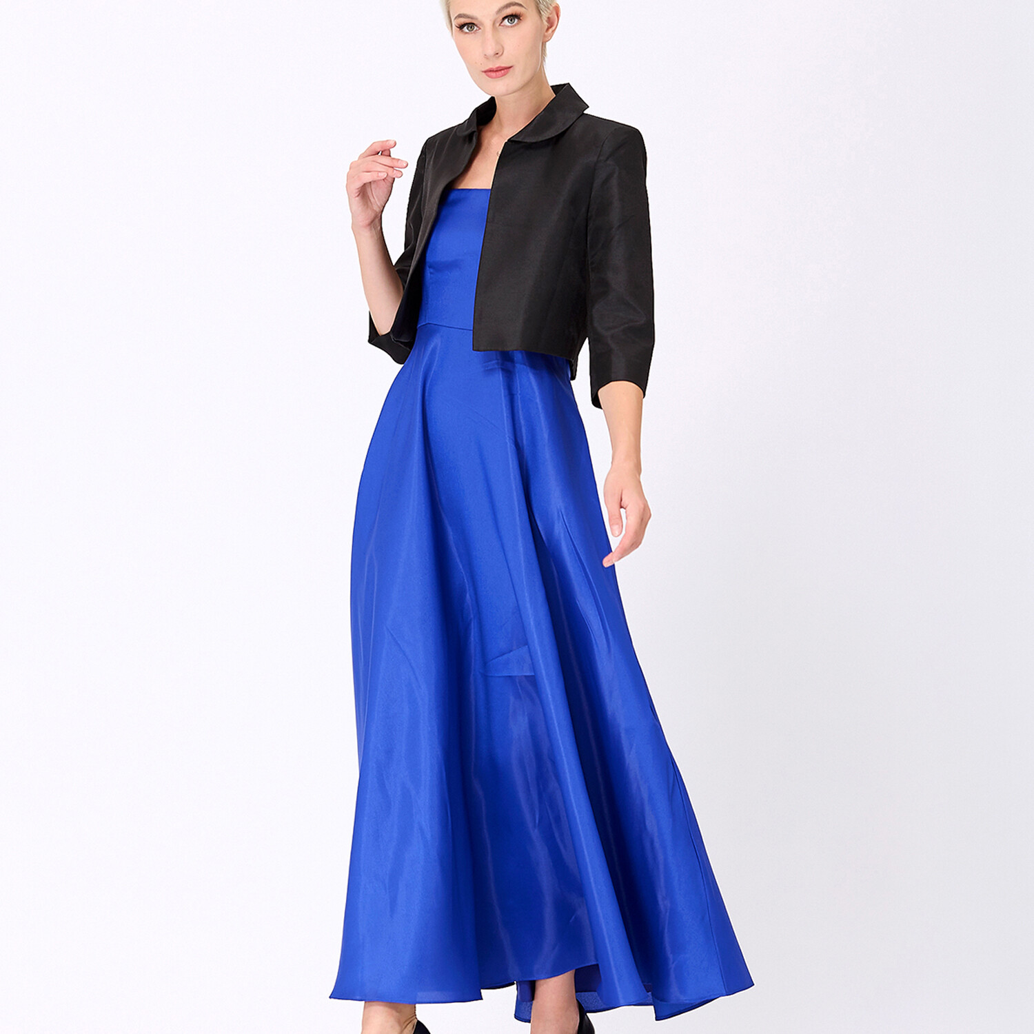 Это элегантное платье с чистыми линиями имеет простой укороченный лиф без бретелей, закрепленный силиконовой резинкой внутри. Застегивается на клипсу и потайную молнию с одной стороны. Щедро расклешенный крой от талии. Яркая вещь для вашего следующего мероприятия или вечеринки. Легко сочетается с укороченным жакетом или болеро. Подробная информация о продукте: - Форма: облегающая и расклешенная - Длина: 125 см - Без рукавов/без бретелек - Потайная молния с левой стороны.
