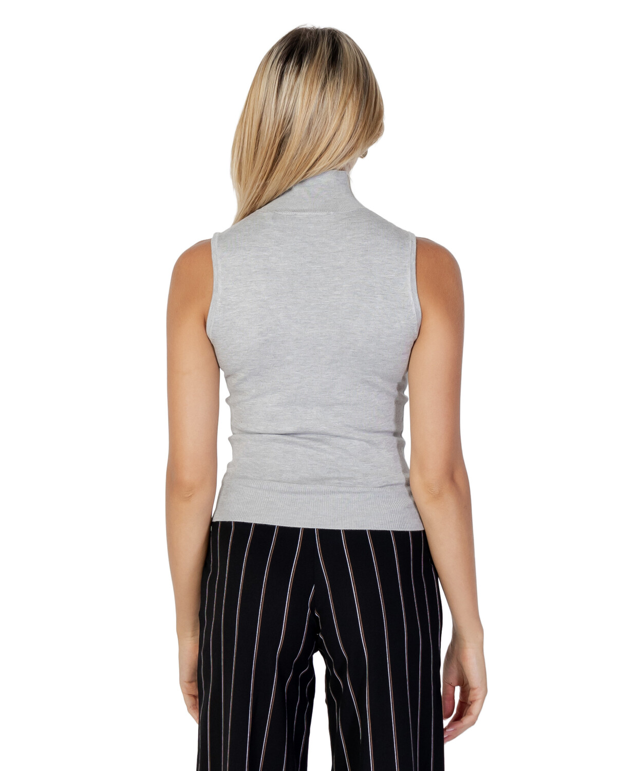 Однотонный вязаный топ с воротником-стойкой, манжетами в рубчик и аппликацией из декоративных камней, облегающей фигуру.