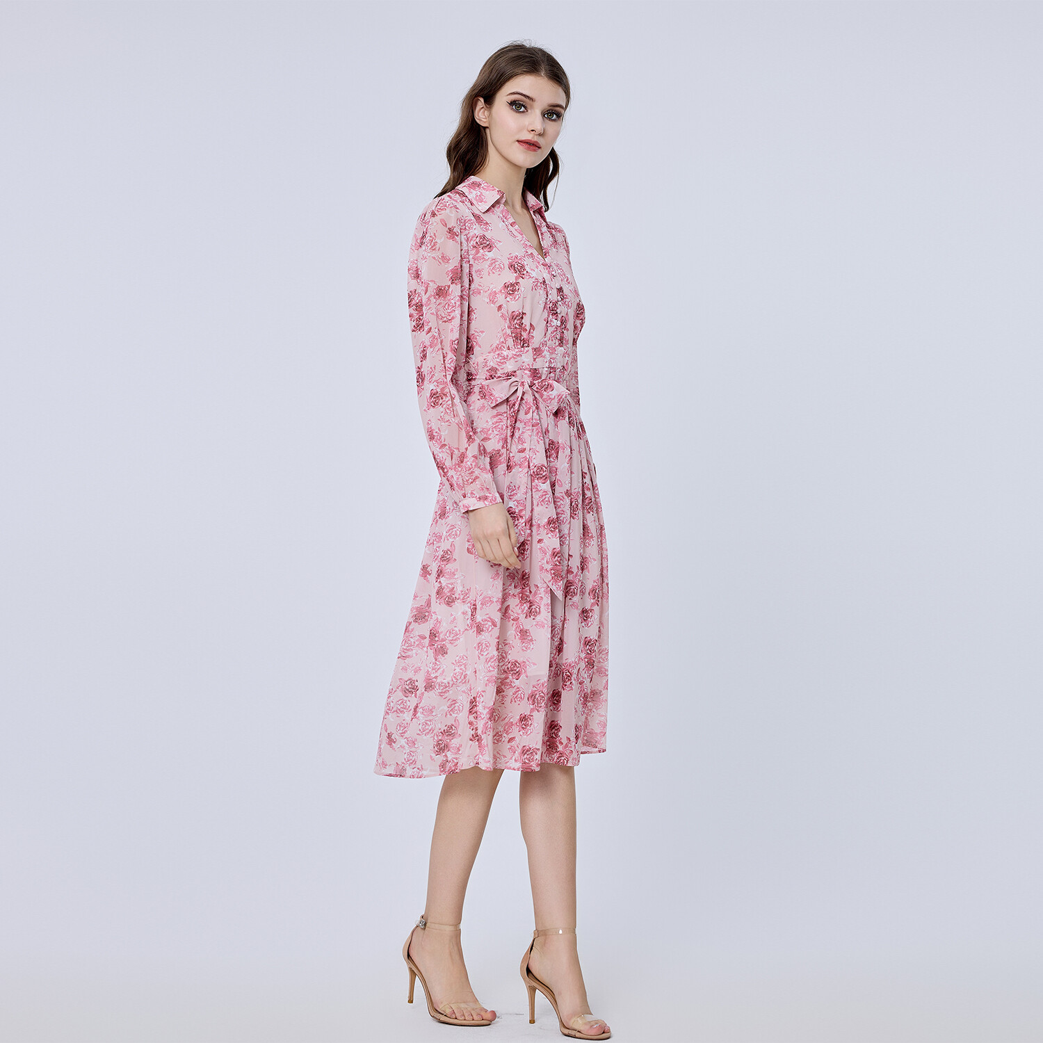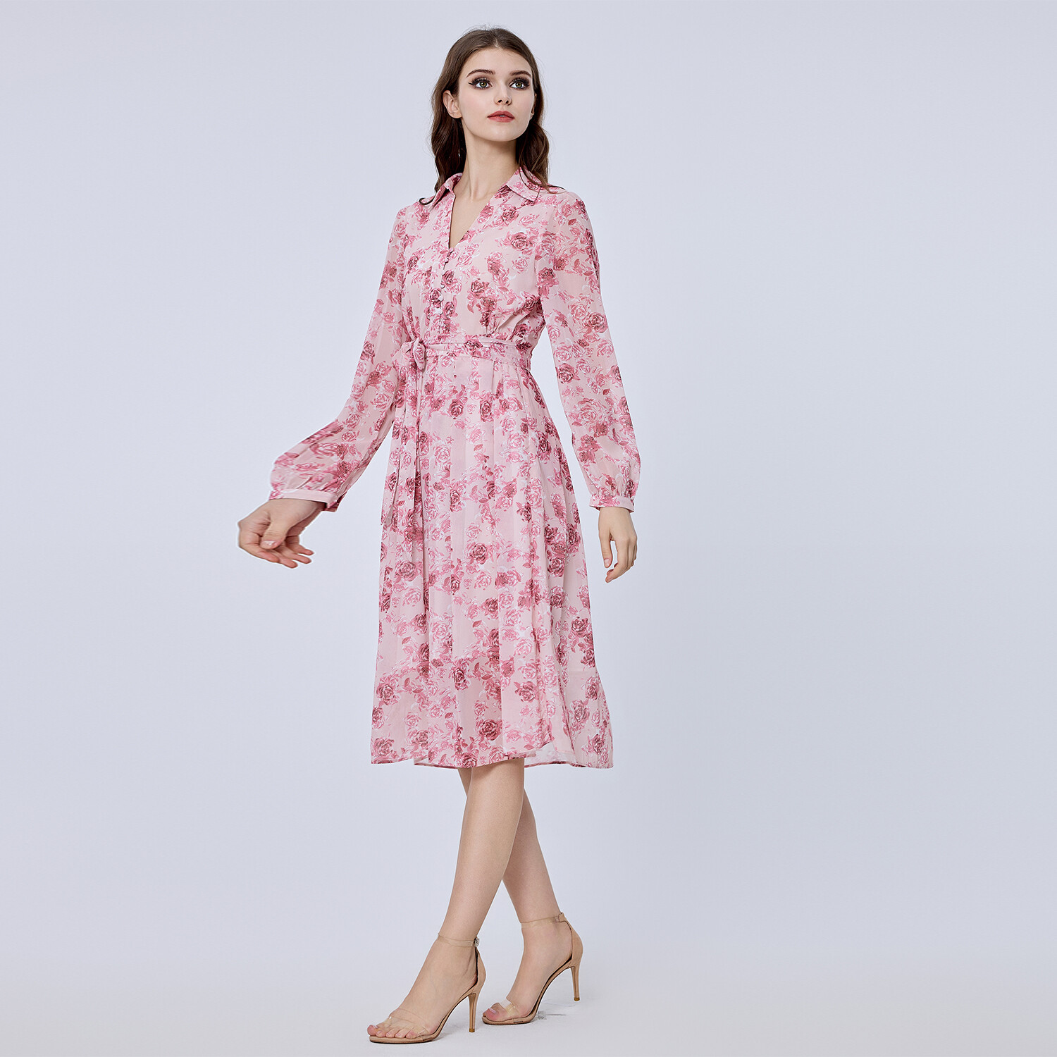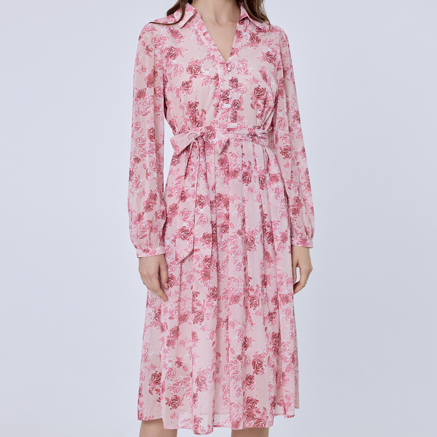 Простой крой, элегантно подчеркивающий силуэт благодаря индивидуальному воротнику, индивидуальному крою с дополнительным поясом и нежному принту тон в тон. Совершенно романтическая и неподвластная времени вещь, которую можно носить с сандалиями, кроссовками или туфлями. Детали изделия: - Форма: расклешенная - Длина: 115 см - Длинные рукава - Рубашечный воротник, V-образный вырез - Застежка на пуговицы спереди по центру.