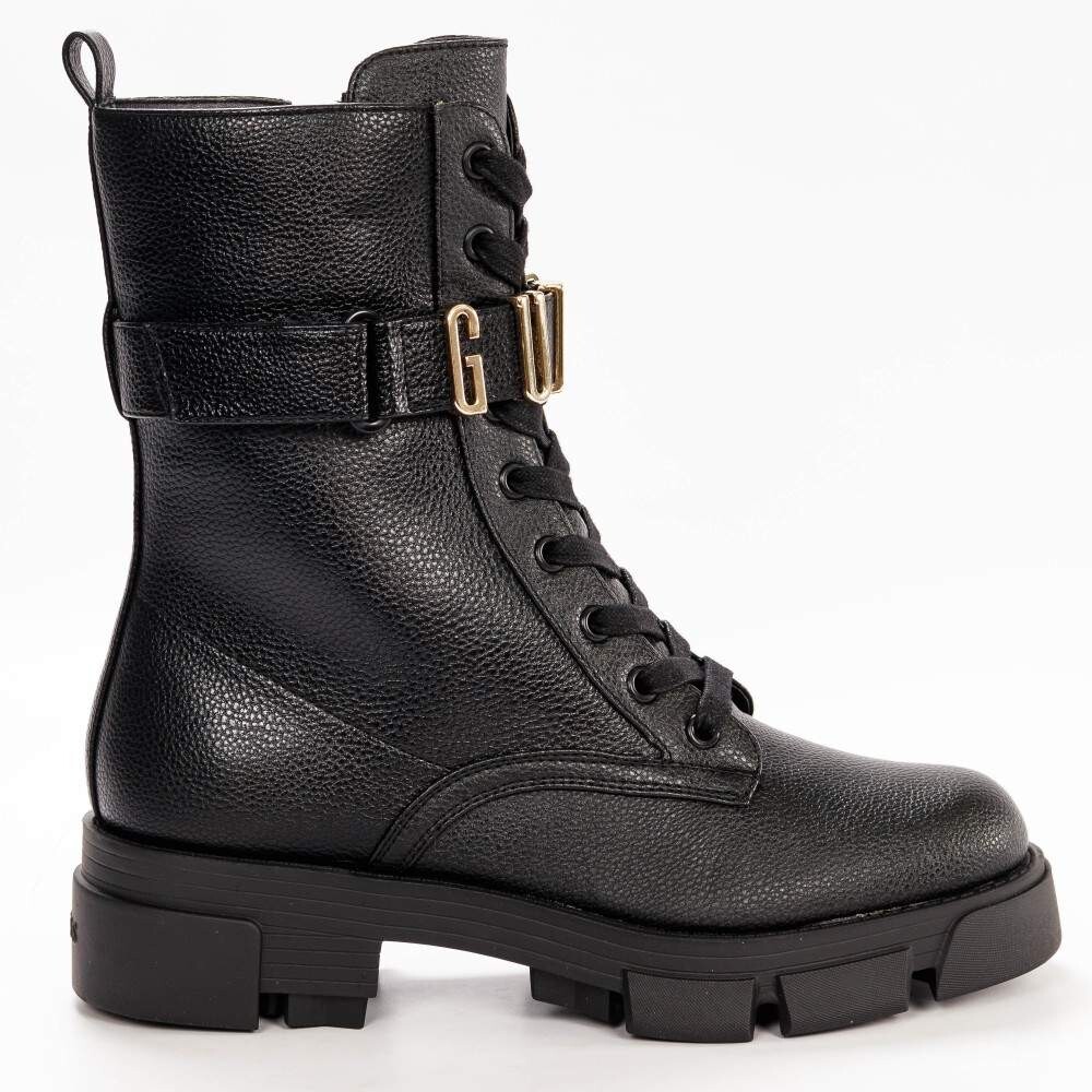 Черные женские кожаные ботинки Guess Madox изготовлены из популярной искусственной кожи, не требующей особого ухода и гидроизоляции. Облегчает чистку обуви зимой!