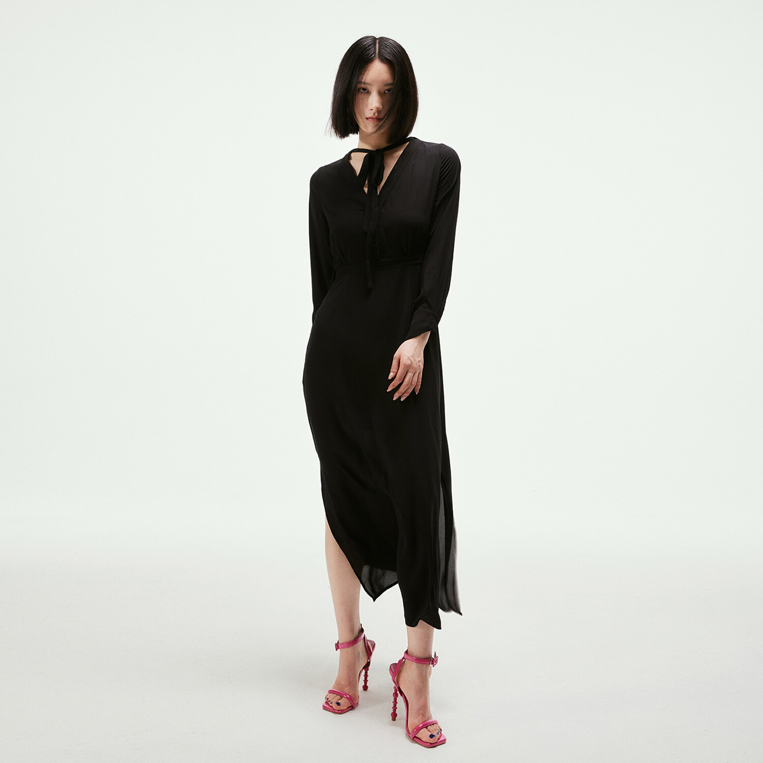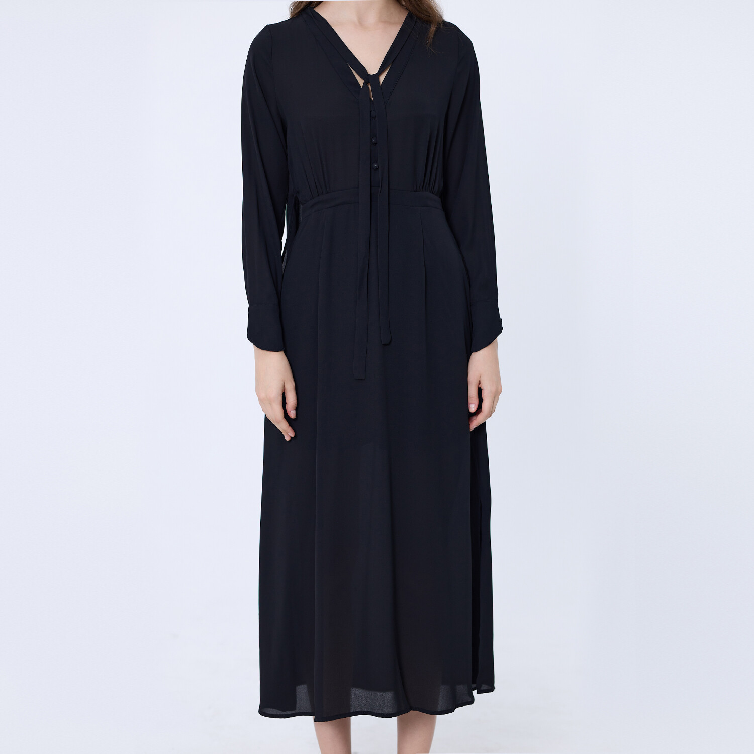 Изделие, элегантно подчеркивающее ваш силуэт, приталенного кроя, слегка трапециевидного объема, заканчивающегося разрезами по бокам. В этом платье много изысканных деталей: потайные пуговицы спереди, завязки на воротнике, манжеты на пуговицах округлого кроя. Носите его с высокими каблуками, чтобы создать гламурный образ, или сочетайте с пиджаком и ботинками, чтобы создать городской стиль. Подробности о товаре: - Форма: трапеция - Длина: 134 см - Длинные рукава - V-образный вырез - Потайная молния с левой стороны.