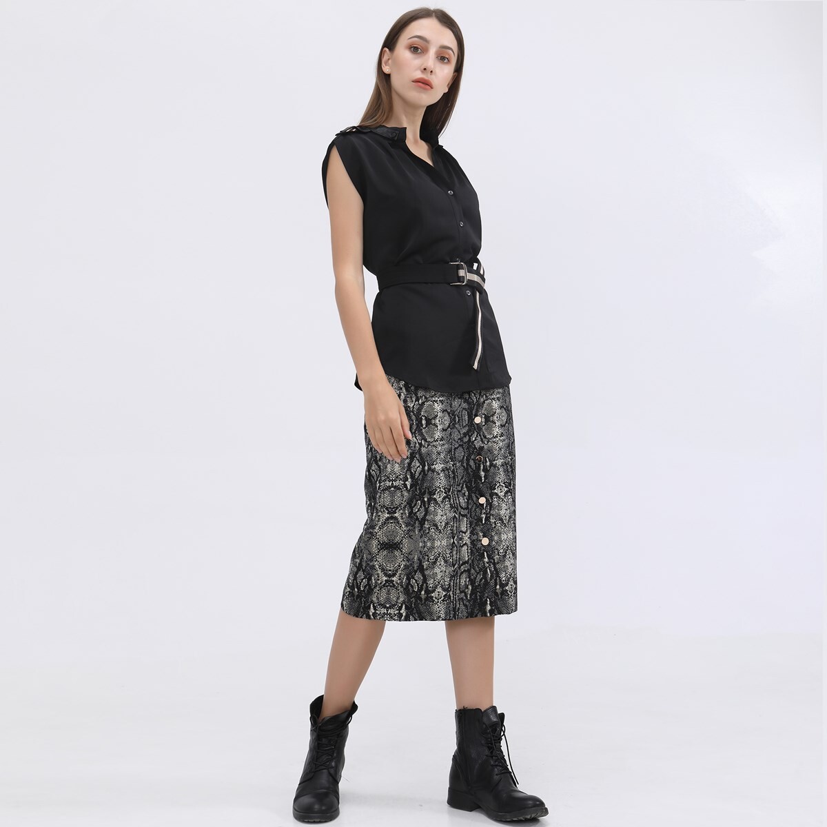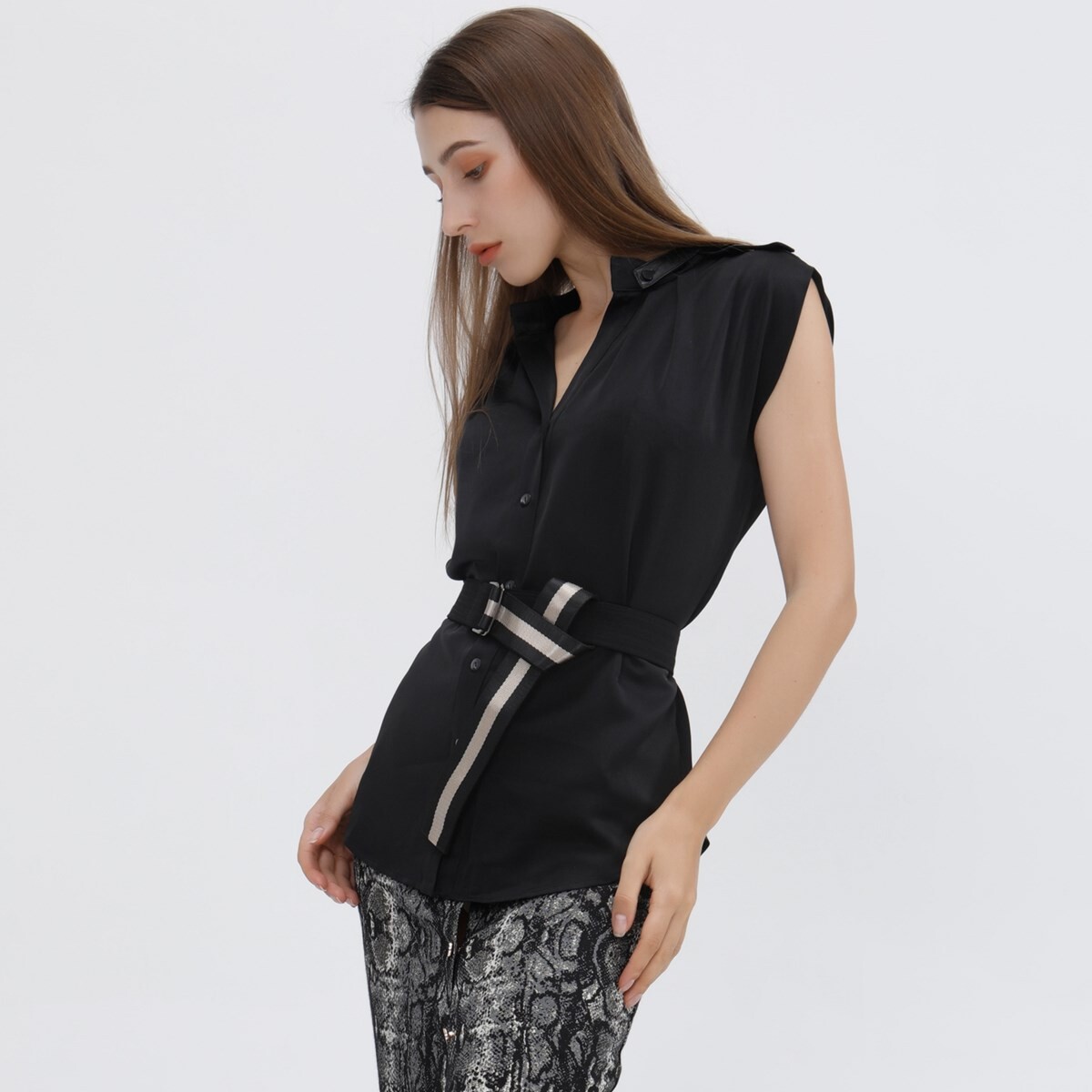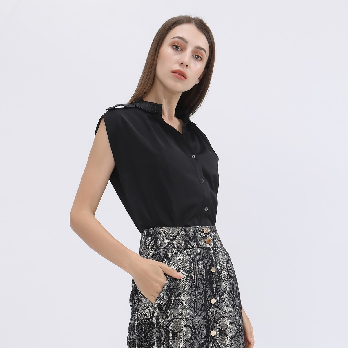 Эта рубашка станет идеальным дополнением элегантного и удобного офисного образа. Современный и шикарный крой, контрастирующий со съемным кожаным воротником и бретелями. Струящаяся ткань с пушистым атласным оттенком. Сочетайте его с юбкой или брюками и пиджаком, чтобы создать изысканный образ. Детали изделия: Форма: прямая, горловина со складками. Длина: 70 см. Без рукавов, прикрытые плечи. Высокий V-образный открытый воротник. Застежка посередине спереди.