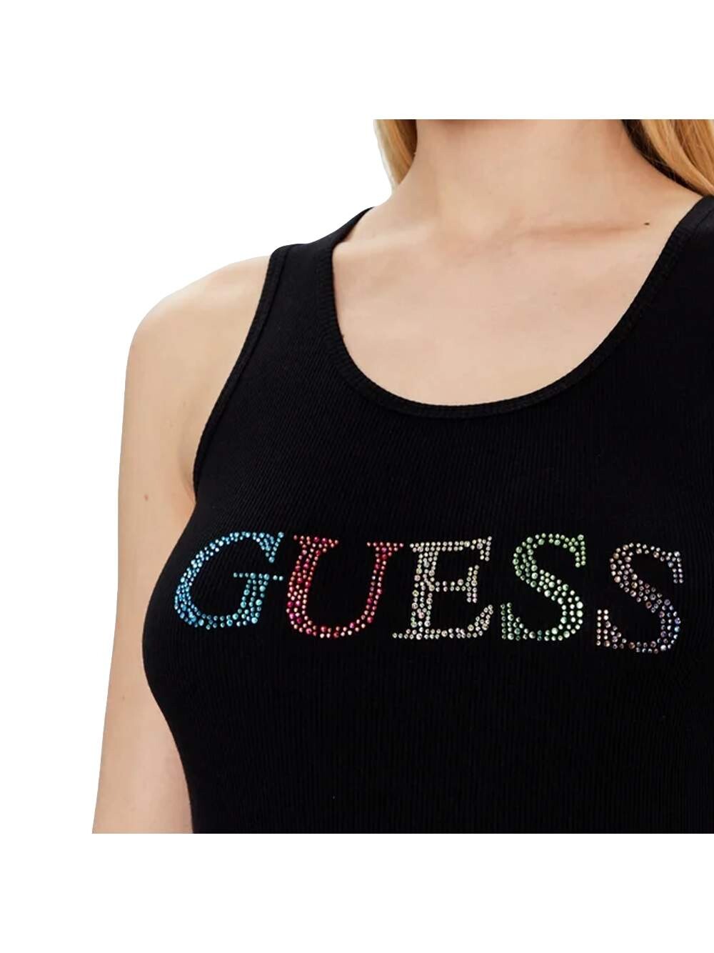 Женская разноцветная майка Guess Logo, черная из синтетики. Аутентичная одежда бренда Guess - Дизайн уличной/спортивной одежды от Guess - Guess для женщин, модно, идеально подходит для повседневной жизни - Майка Guess черного цвета идеально сочетается с остальным гардеробом - Удобный синтетический материал - классика - Многоцветный логотип -.
