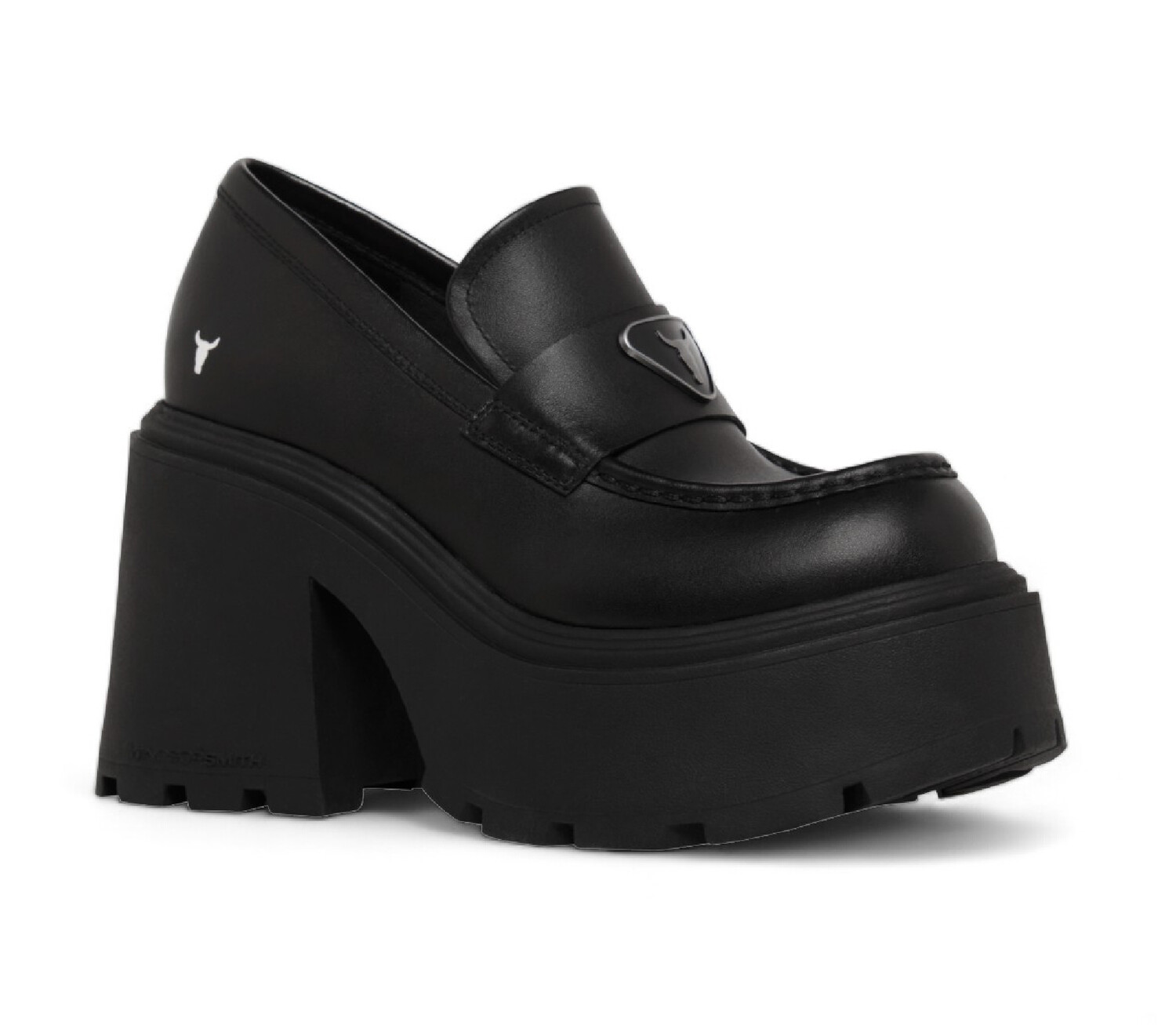 Эти туфли на массивной платформе привнесут смелость и стиль в ваш гардероб. Эти лоферы, украшенные культовым логотипом Windsor Smith Bull с металлической отделкой, имеют современный дизайн. Легкая подошва с выступами и высокий каблук делают эти туфли привлекательными для уверенных и необычных образов. Верх из черной кожи. Массивный высокий каблук и платформа. Логотип Windsor Smith на металлической пластине. Символ быка на верхней части. Круглый носок. Легкая массивная платформа с выступами из термопластичного каучука. Высота каблука: 12 см. Высота платформы: 5,3 см.