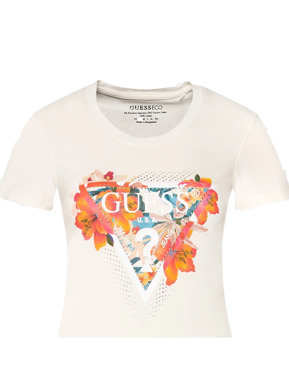 Женская футболка Guess с тропическим треугольником, белый хлопок. Аутентичная одежда бренда Guess - дизайн уличной/спортивной одежды от Guess - Guess для женской моды, идеально подходит для повседневной жизни - Футболка Guess белого цвета идеально сочетается с остальной частью вашего гардероба - материал хлопок, удобный - классический - тропический треугольник - .