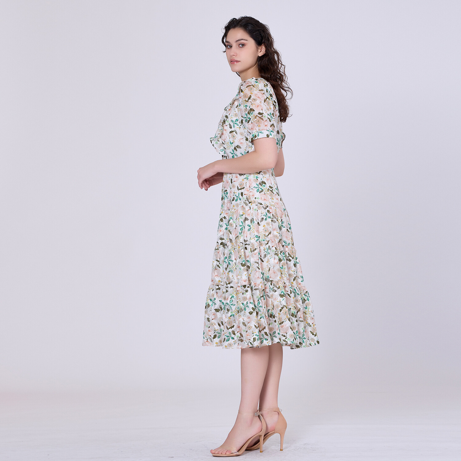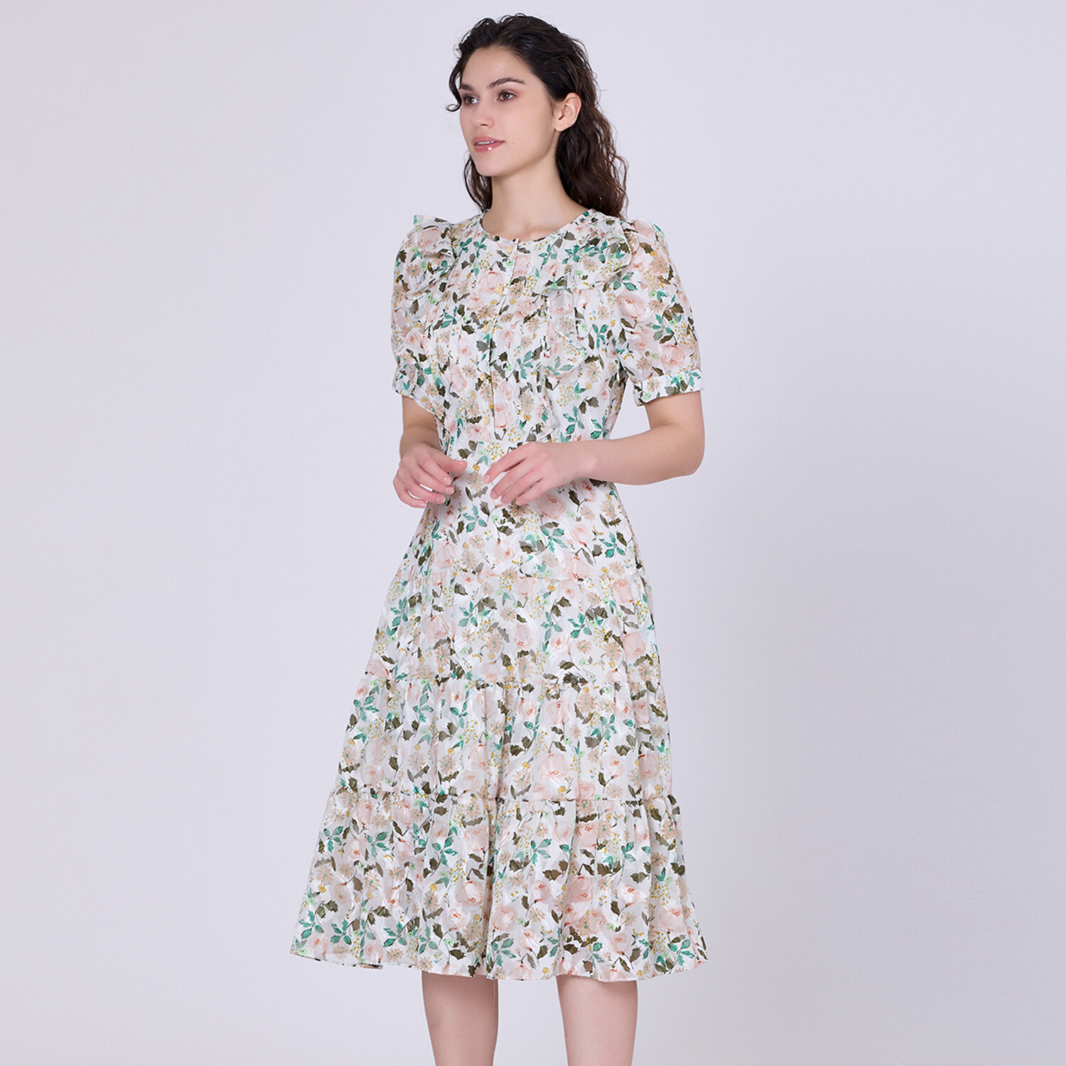 Легкое и романтичное изделие из фактурного муслина с изысканным цветочным принтом. Структура груди за счет пришитых складок и рюшей. Расклешенная юбка из потертых вставок для большего объема. Изящный силуэт с приталенной талией. Подходит для полуофициальных мероприятий, таких как бранч, вечеринка в саду или весенняя свадьба. Подробная информация о товаре: Длина: 116 см. На модели размер 10. Рост модели 5 дюймов7. Форма: Приталенный крой. Короткие рукава. Круглый воротник. Потайная молния с левой стороны.