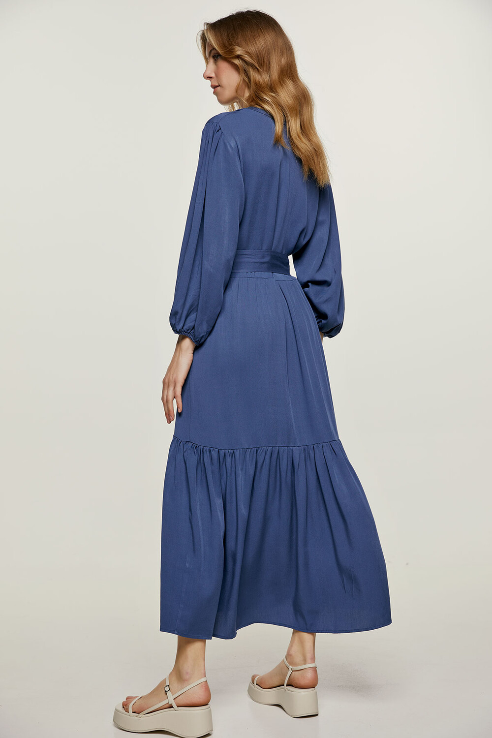 Темно-синее платье миди изготовлено из тенселя. Имеет V-образный вырез с двумя завязками спереди. Рукава длиной ¾ с резинкой на манжетах создают эффект воздушного шара. Платье состоит из двух ярусов с рюшами и пояса из той же ткани.