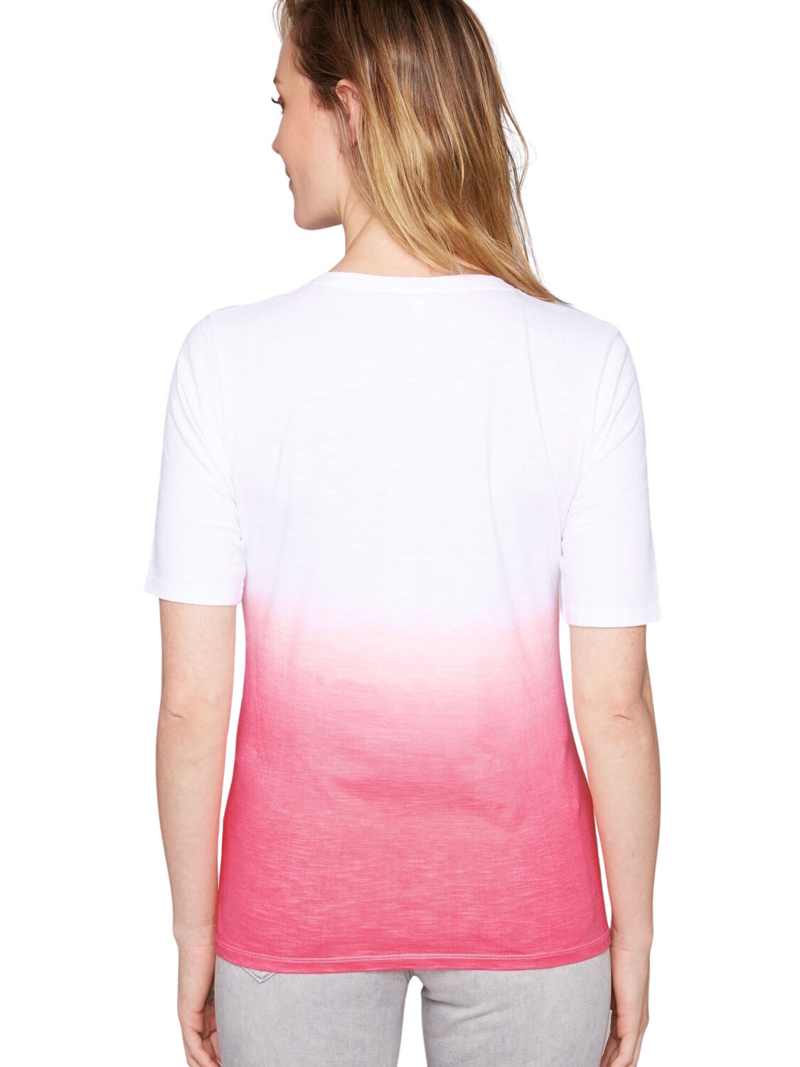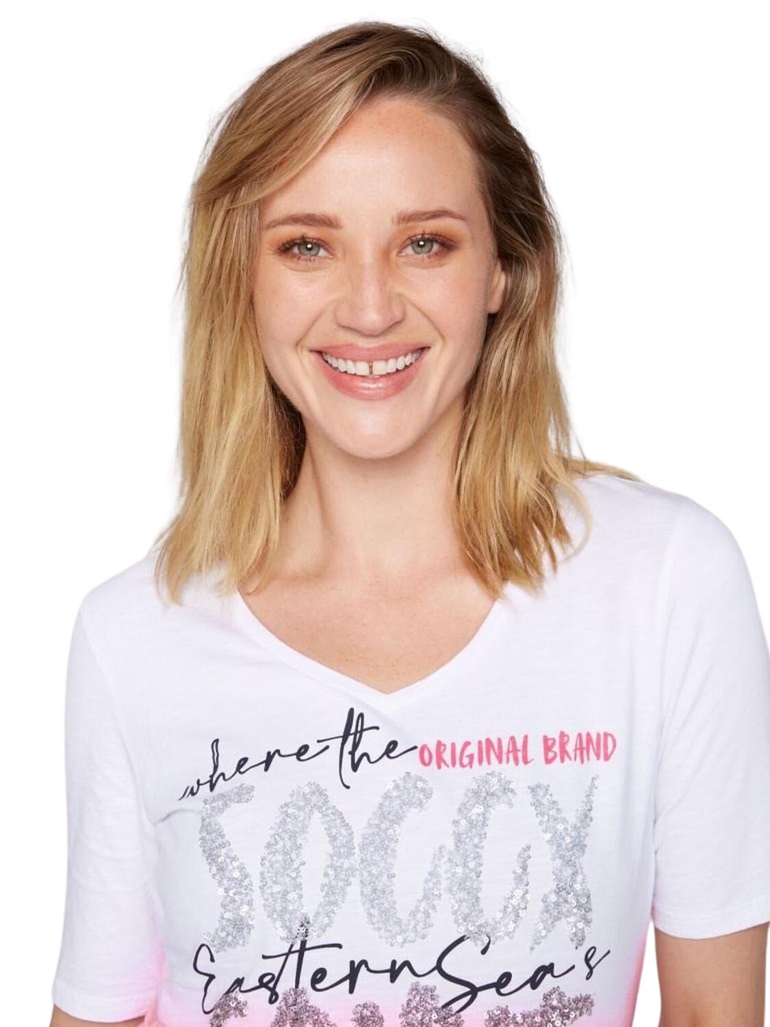 Япония послужила источником вдохновения для создания привлекательного дизайна женской футболки SOCCX. Надпись оттенена пушистыми пайетками. Не забывайте: прохладный цветовой градиент подчеркивает произведение искусства. Образ завершает женственный V-образный вырез.