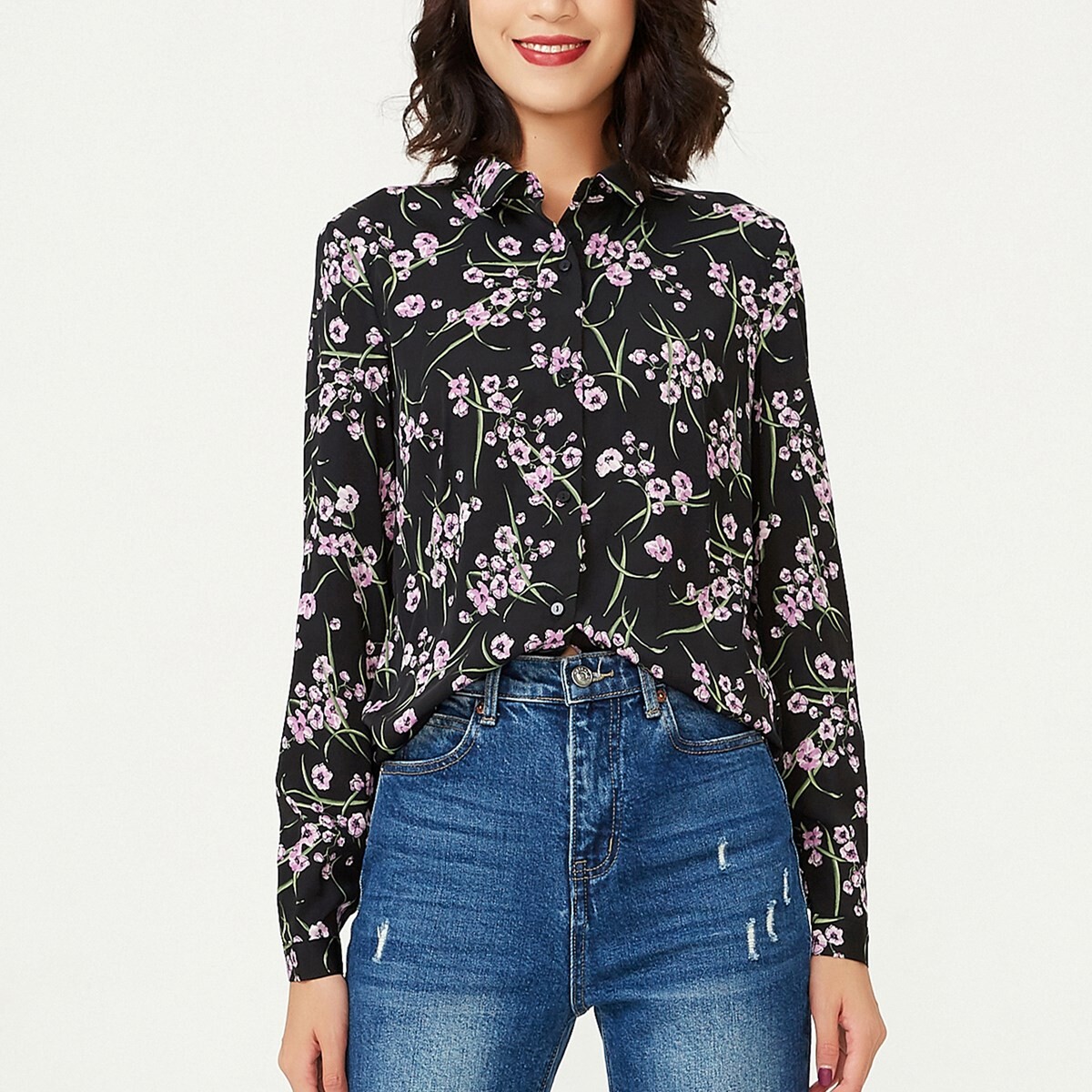 Эта рубашка классического кроя изготовлена из полиэфирной фланели с контрастным цветочным принтом. Для официального образа в офисе с юбкой-карандаш или для непринужденного образа с узкими джинсами и ботинками. Детали изделия: Форма: прямая Длина: 70 см. Длинные рукава, пуговицы на запястье. Рубашечный воротник. Бутоннаж посередине спереди. Рост модели 1м72, размер 36.