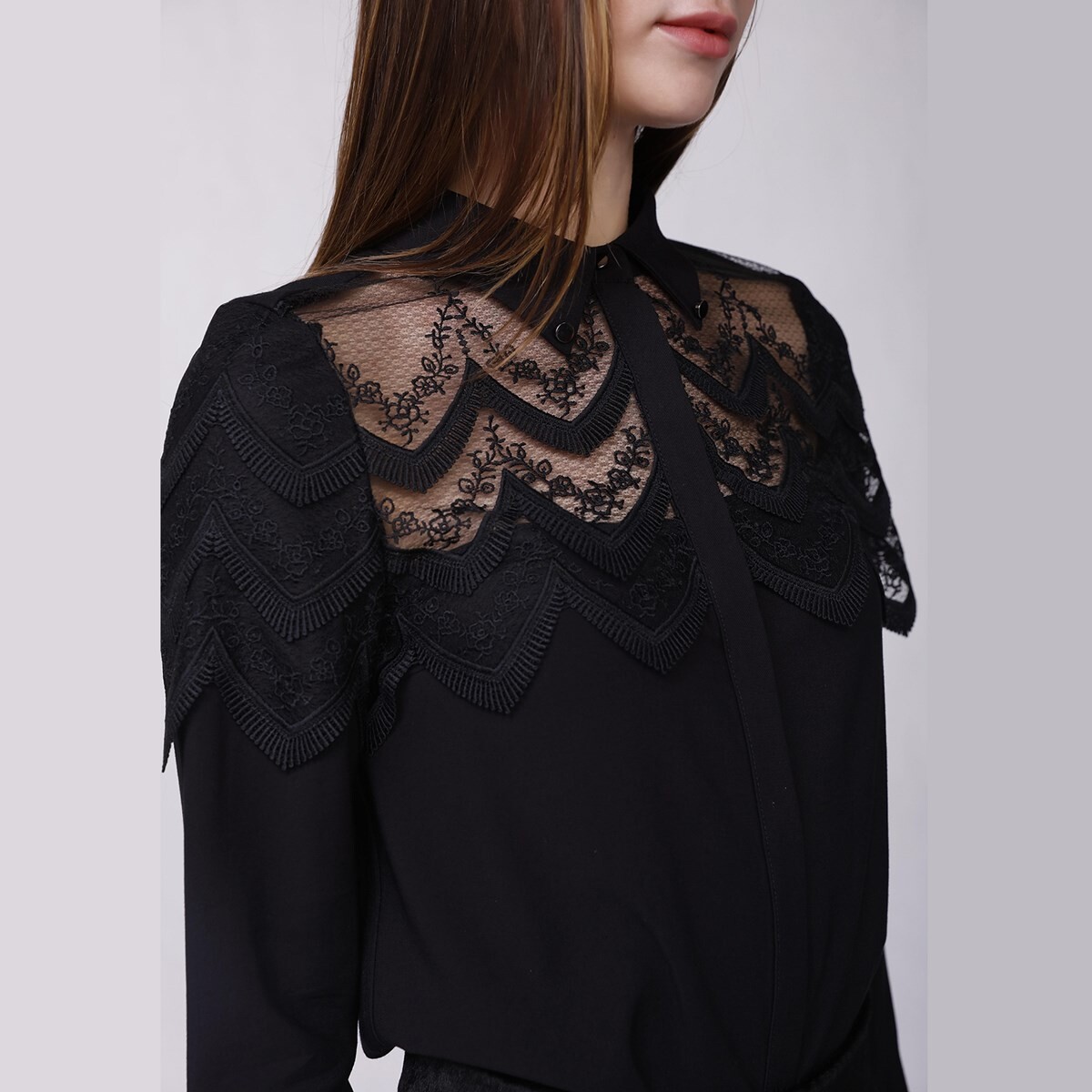Изысканная рубашка, которая выглядит одновременно женственно благодаря кружевному декору на плечах и андрогинно благодаря минималистичному крою. Элегантная одежда, подходящая как для офиса, так и для вечера: ее можно носить с официальной юбкой, костюмом или с более повседневными вещами, например, с джинсами. Детали изделия: Прямая форма. Длина: 68 см. Средний бутонаж спереди. Длинные рукава. Рубашечный воротник. Рост модели 1м77, размер 38.