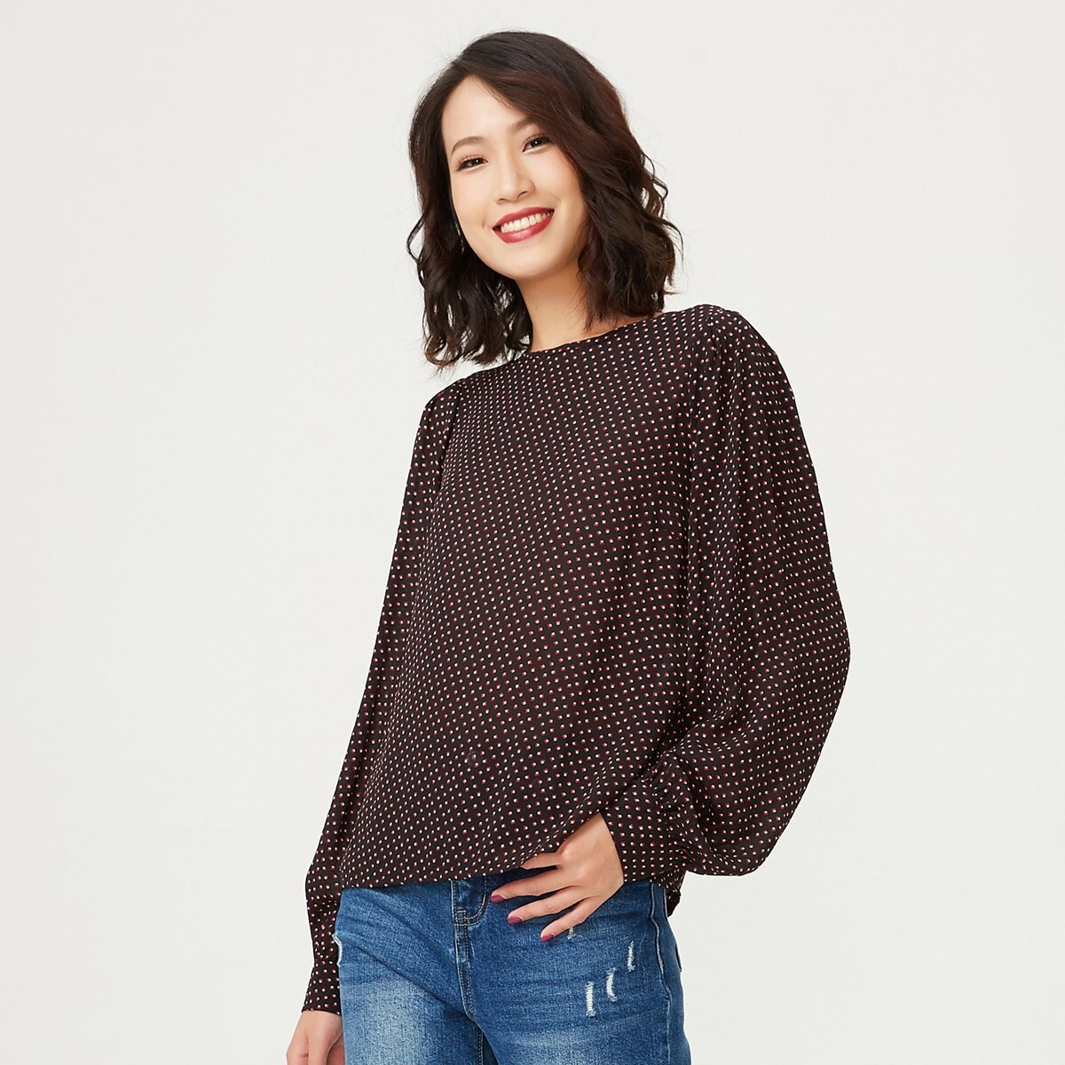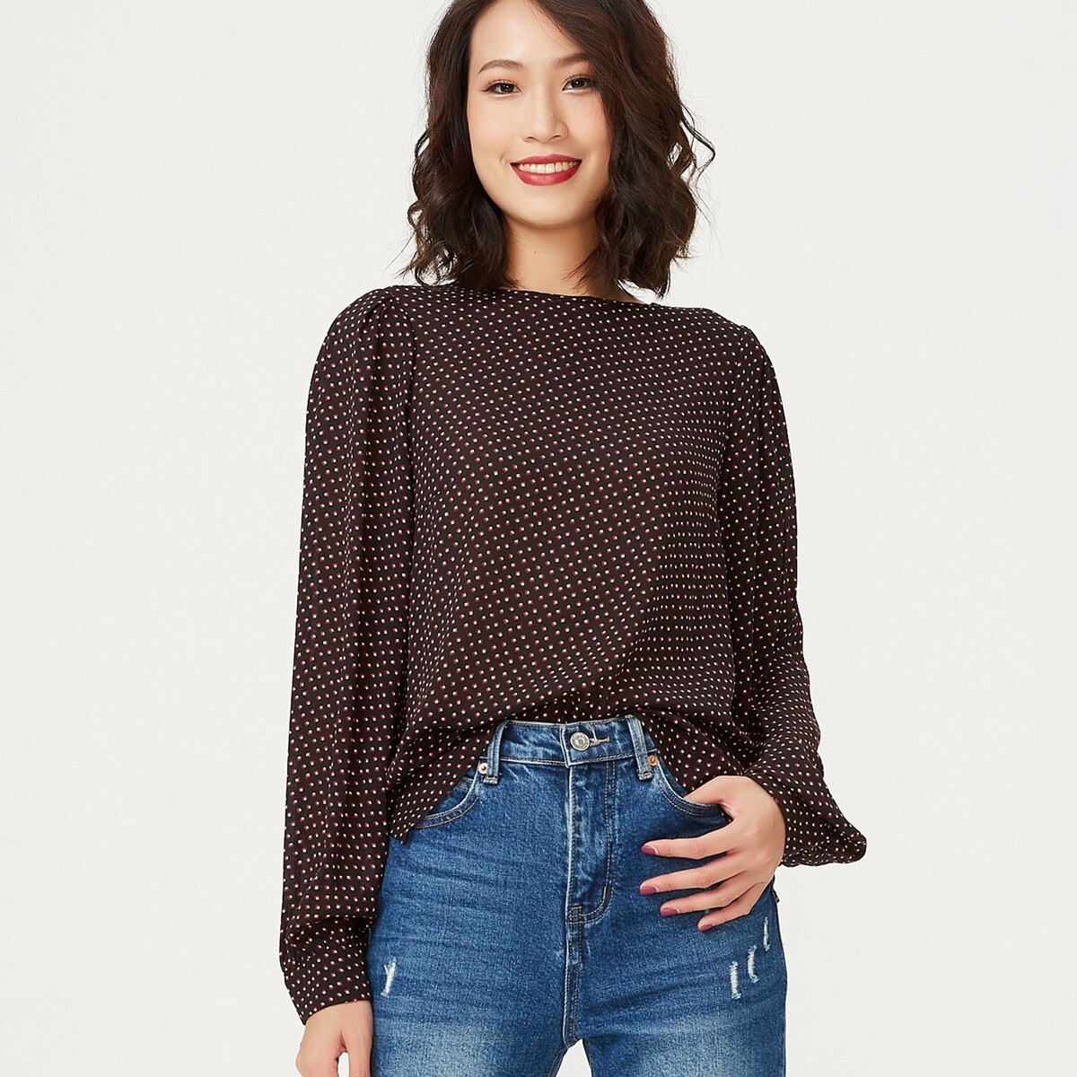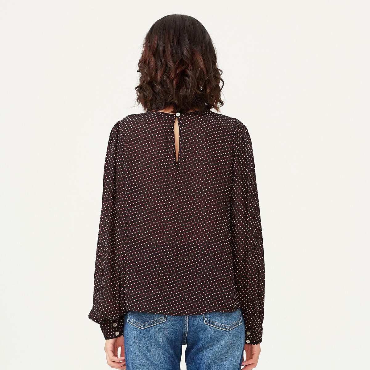 Минималистское и вневременное пространство: блузка с круглым вырезом, застегивающимся сзади, и длинными рукавами с пуговицами на запястье. Свободный и удобный силуэт с нотками ретро, универсальная вещь, которую можно носить без умеренности. Сочетайте с юбкой-карандашом для формального образа в офисе или с джинсами скинни и ботинками для более повседневного стиля. Информация о товаре: Форма: прямая Длина: 70 см. Длинные рукава, пуговицы на запястье. Круглый воротник. Средняя пуговица на воротнике сзади. Рост модели 1м72, размер 36.