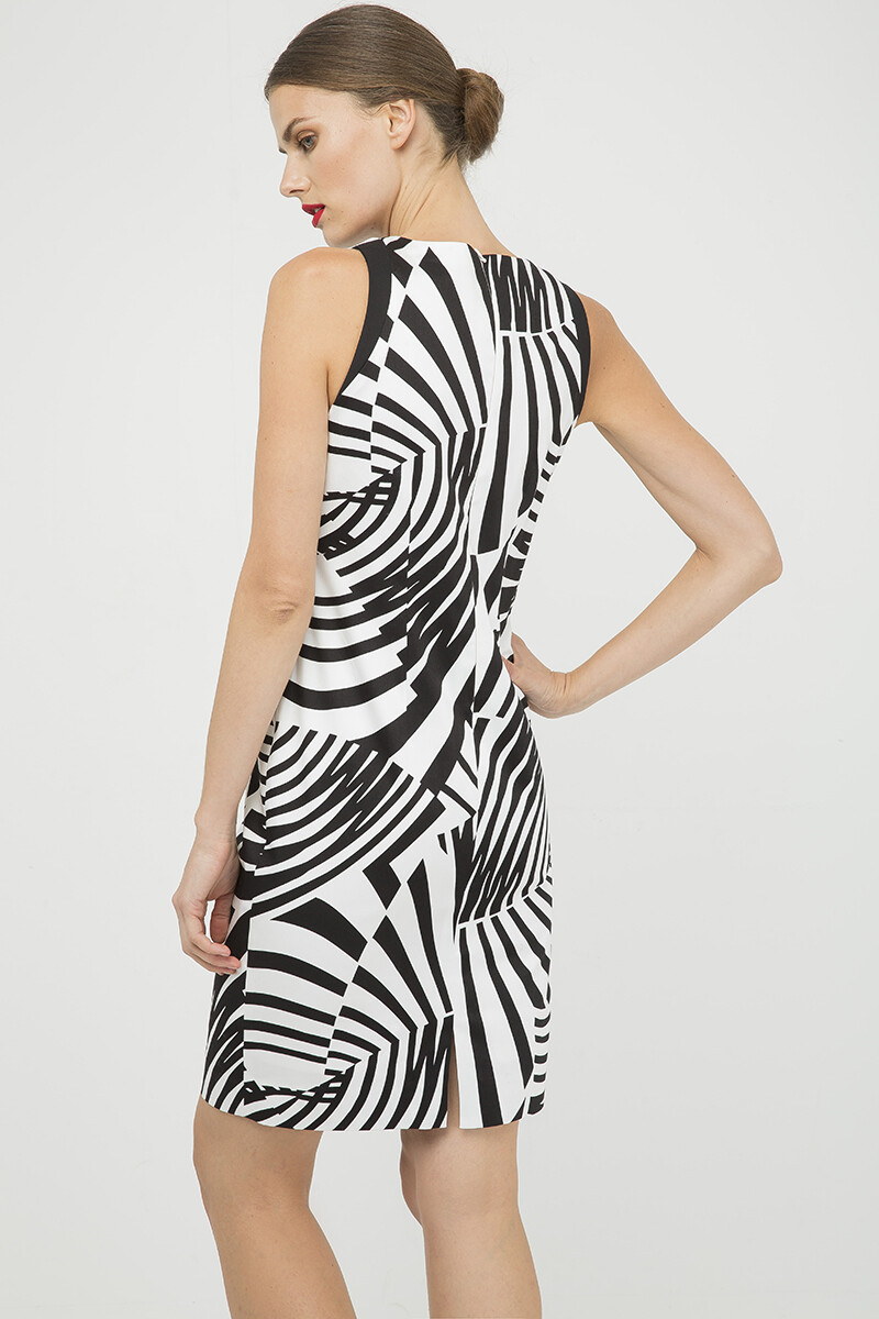 Платье без рукавов из эластичного габардина с принтом. Немного завышены плечи. Контрастная черная окантовка на проймах. Застегивается на потайную молнию сзади. Небольшой разрез на спине. Приталенный силуэт. Полностью на подкладке из белой ткани. Рост нашей модели 178 см, на ней 36 размер. Размеры для 38 размера (в см): окружность груди — 42; длина тела-95; размер талии – 41; ширина плеч – 27; Ширина низа - 46. Одежда приталенная.