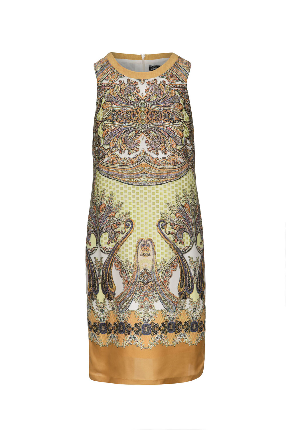 Платье с рисунком пейсли изготовлено из тканого материала. Без рукавов и с круглым вырезом. На горловине золотистая декоративная строчка. Платье застегивается сзади на потайную молнию. Сзади небольшой разрез шириной 14 см. Платье имеет утонченный А-силуэт и полностью на подкладке. Рост нашей модели 172 см, размер 36/S. Мерки для 36 размера (в см): плечо – 30; грудь – 43; талия – 45; Подол – 50; Длина тела – 94. 100% полиэстер.