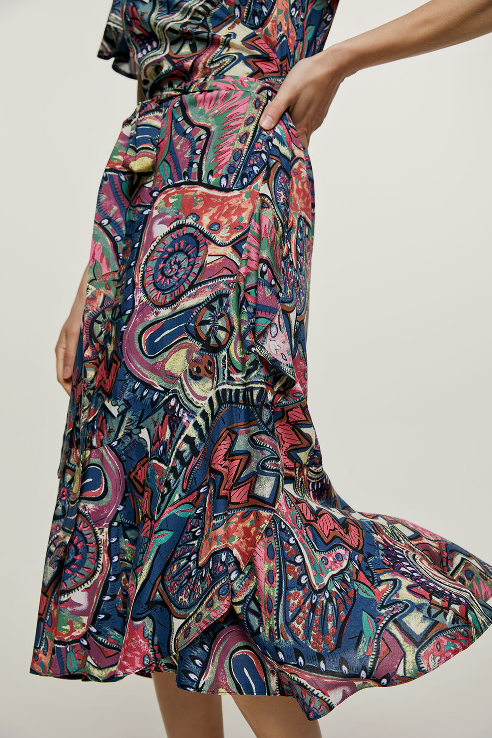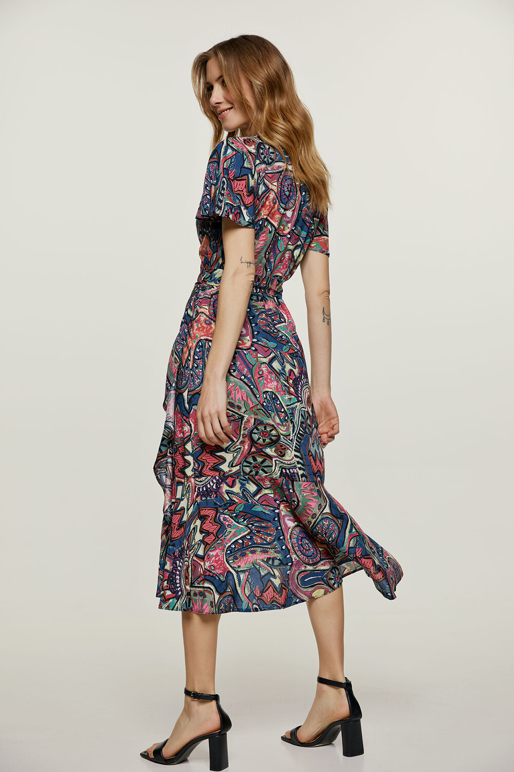 Летнее платье с запахом выполнено из тканого материала с принтом. Имеет V-образный вырез и короткие рукава с воланами. На талии завязываются ленты из той же ткани. По низу волан шириной 26 см. Платье выполнено в стиле миди.