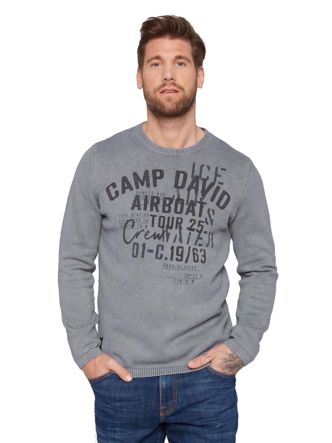 Мужской вязаный свитер – незаменимая вещь в гардеробе. Модель стандартного кроя, изготовленная из высококачественного материала, обеспечивает высокий уровень комфорта. Свитер имеет классический круглый вырез с ребристой отделкой. Манжеты и подол также имеют ребристый вид. Потертый дизайн придает свитеру особенный вид. Крупный принт с этикеткой спереди придает свитеру визуальную изюминку. Принт меньшего размера на шее и нашивка с этикеткой над нижним краем завершают дизайн.