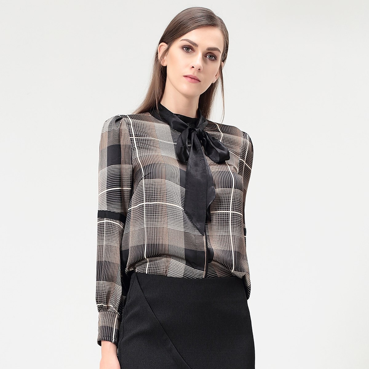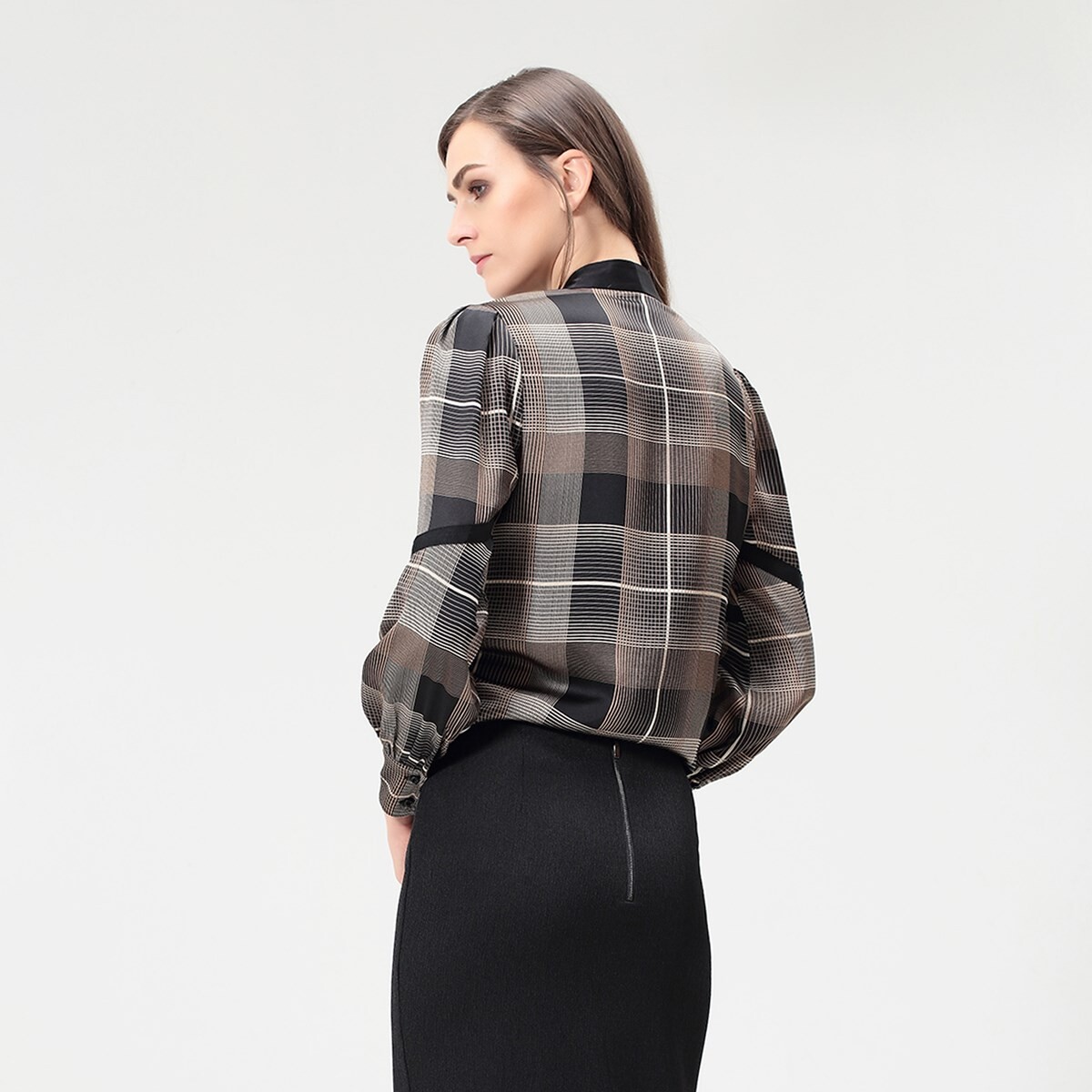 Один из хитов осени этого года — макро-тартановый принт на струящейся атласной ткани. Прекрасное дополнение к формальному гардеробу, например, к простому костюму. Развлекайтесь с атласным воротником-стойкой: завяжите его бантом или галстуком или оставьте свободным, чтобы выглядеть непринужденно. Детали изделия: Прямая форма. Длина: 70 см. Длинные рукава. Воротник-бантик. Бутоннаж по центру спереди.