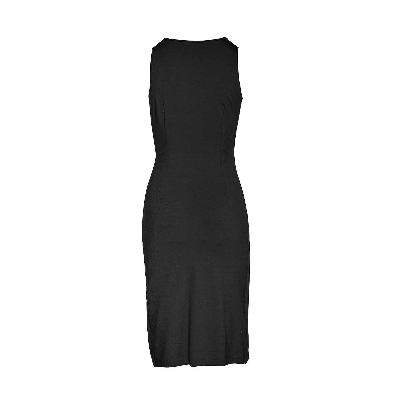 Однотонное платье без рукавов из эластичного трикотажа: вискоза-эластан. Передняя часть с запахом, заканчивающаяся складками на талии слева спереди. Однотонная эластичная подкладка в области спины. Мерки для размера 38/М (в см): ширина плеч - 29, обхват груди - 38, обхват талии - 32, обхват подола - 42, длина тела - 102. 92%Вискоза-8%Эластан