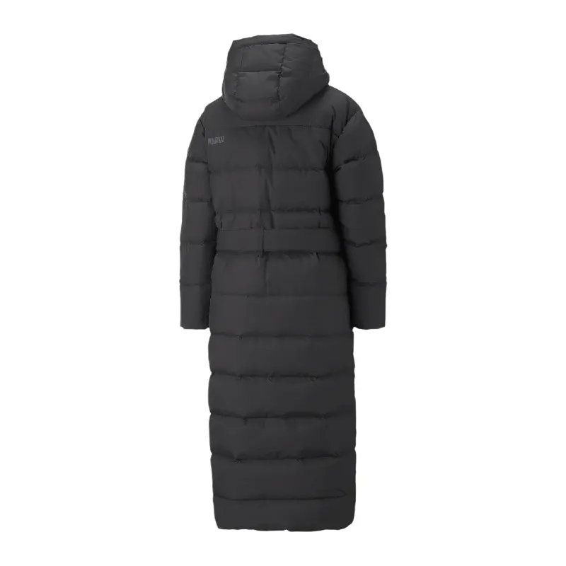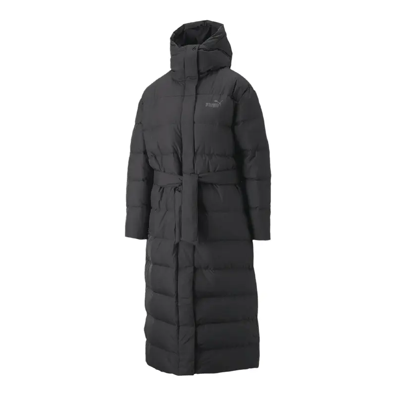 Пуховик выполнен из стеганного текстиля. Модель длинного прямого кроя. Детали: застежка на молнию, передние карманы, воротник стойка, пояс в комплекте.