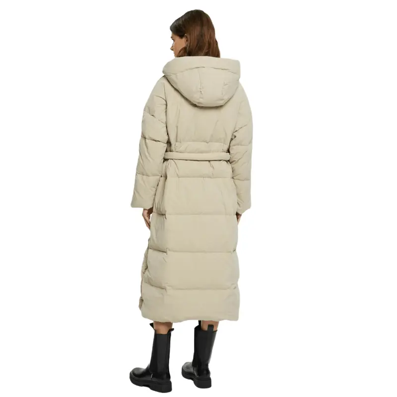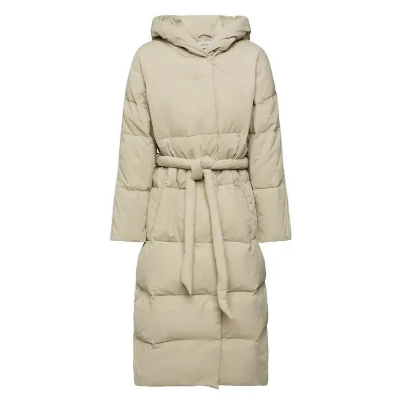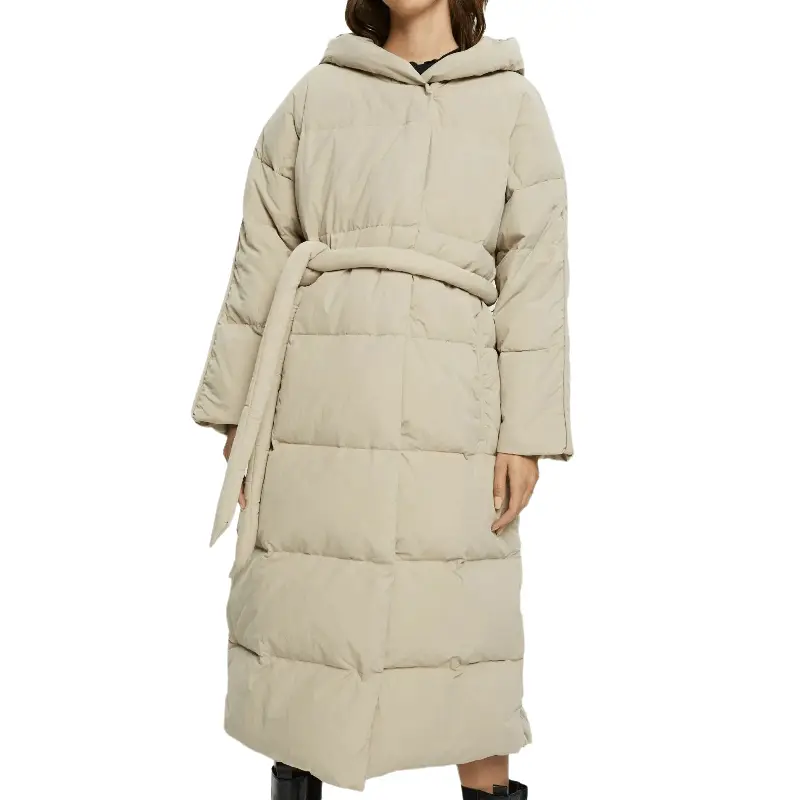 Пуховик выполнен из стеганного текстиля. Модель длинного прямого кроя. Детали: застежка на молнию, передние карманы, пояс в комплекте, несъемный капюшон.