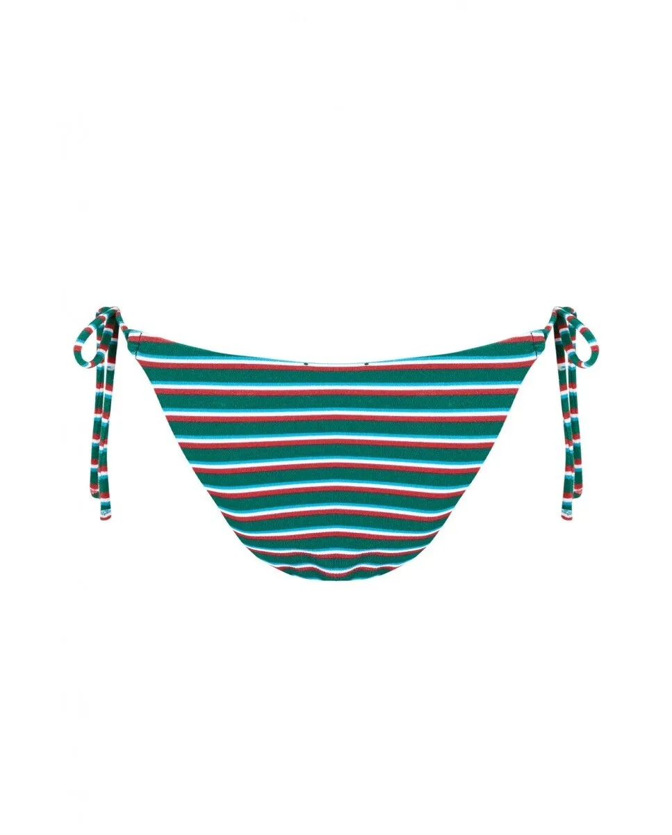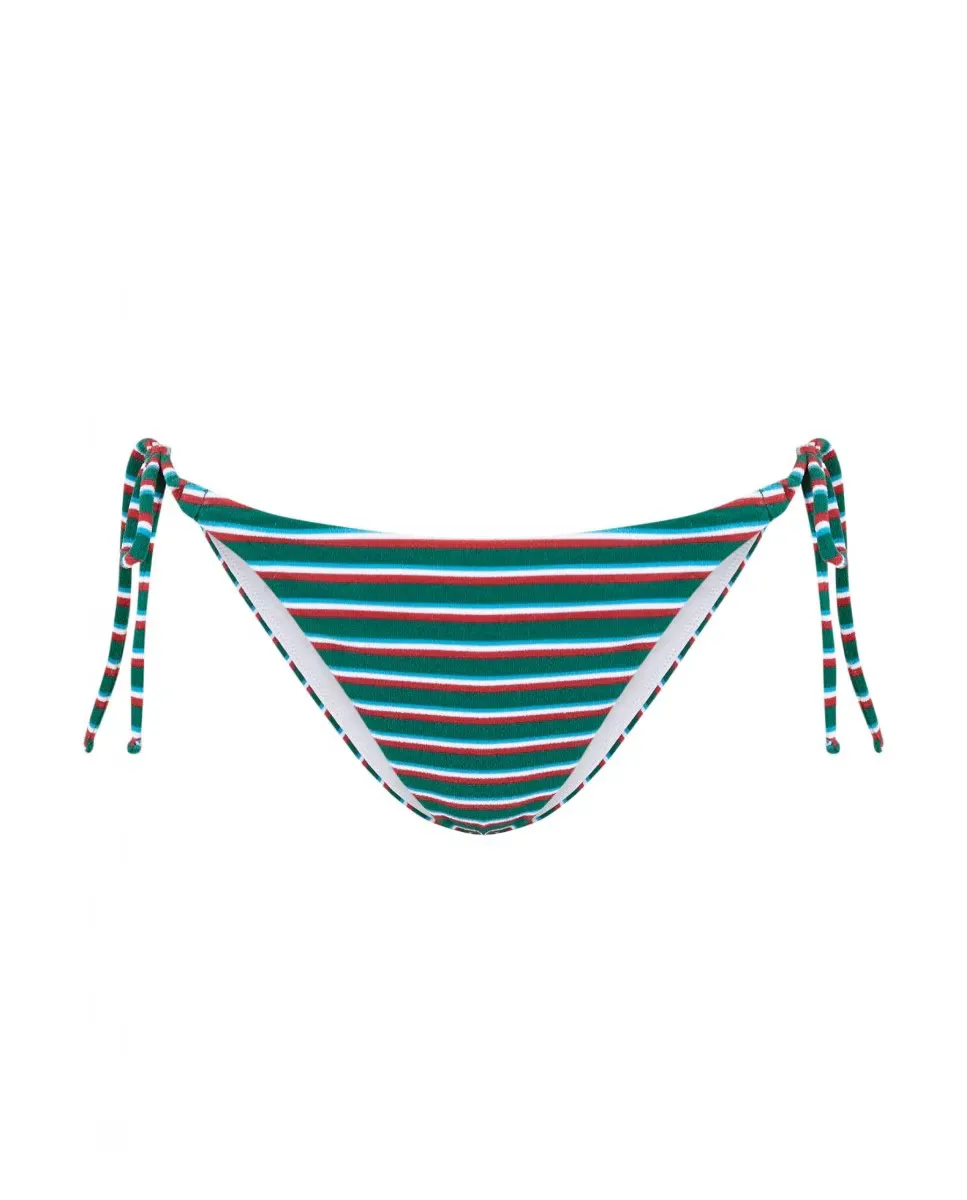Плавки бикини с белыми и красными полосками на зеленом фоне из специальной ткани с эффектом полотенца для купания. Трусики на подкладке спереди и сзади, с завязками сбоку. На модели трусики размера S. Ее рост 1,72 см, талия 66 см и бедра 91 см.