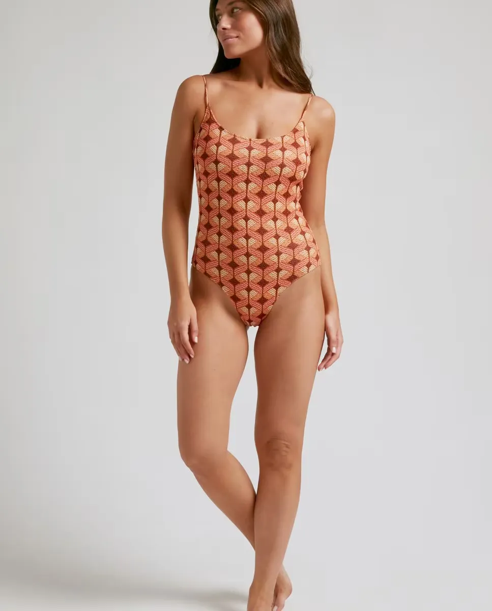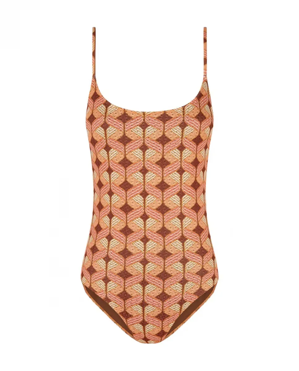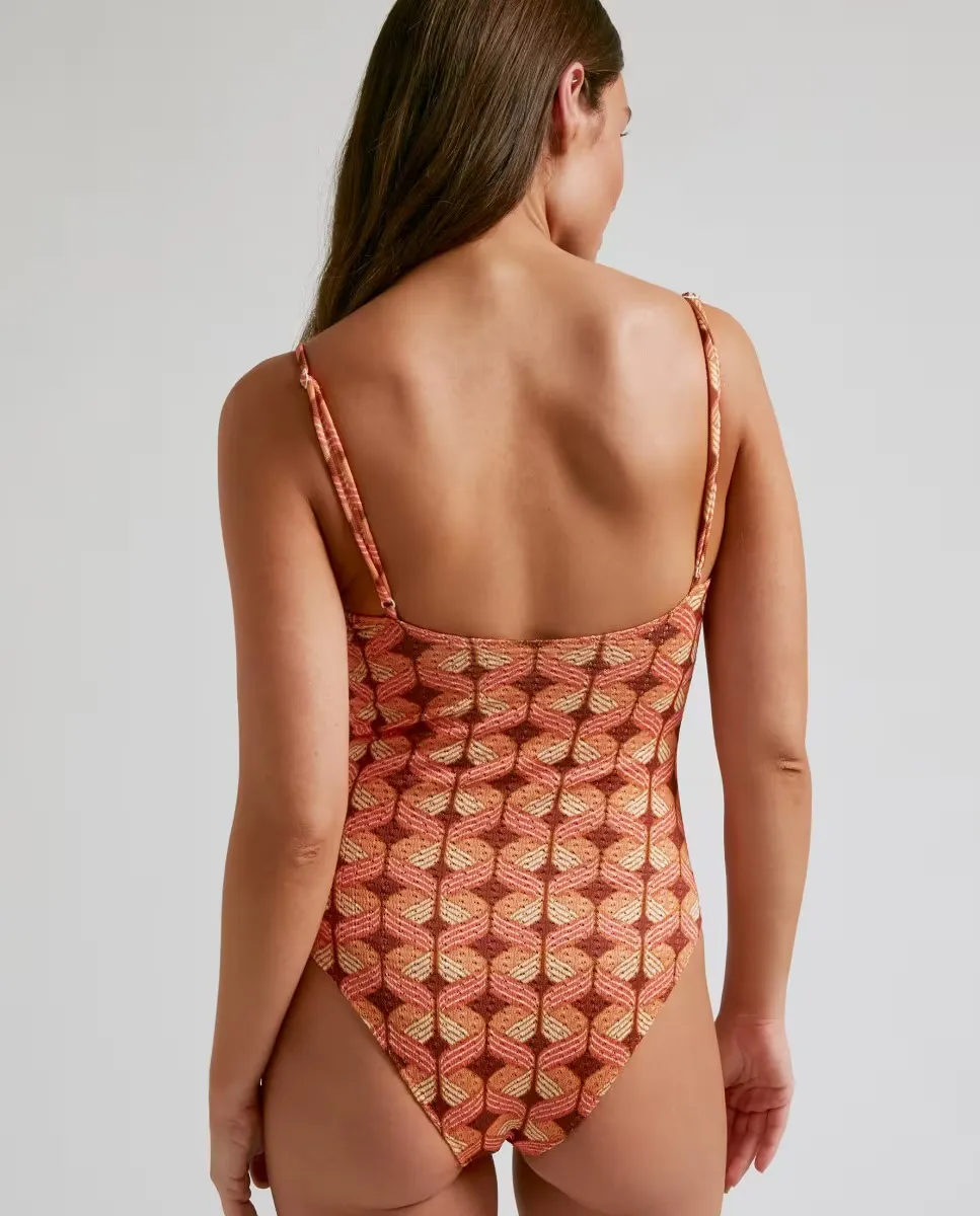 Купальник с круглым вырезом и винтажным принтом с каймой в оранжевых и коричневых тонах. Имеет съемные поролоны и регулируемые тонкие бретели. Это подкладка спереди и сзади. На модели размер S. Ее рост 1,75 см, обхват груди 82 см, обхват талии 61 см и обхват бедер 90 см.