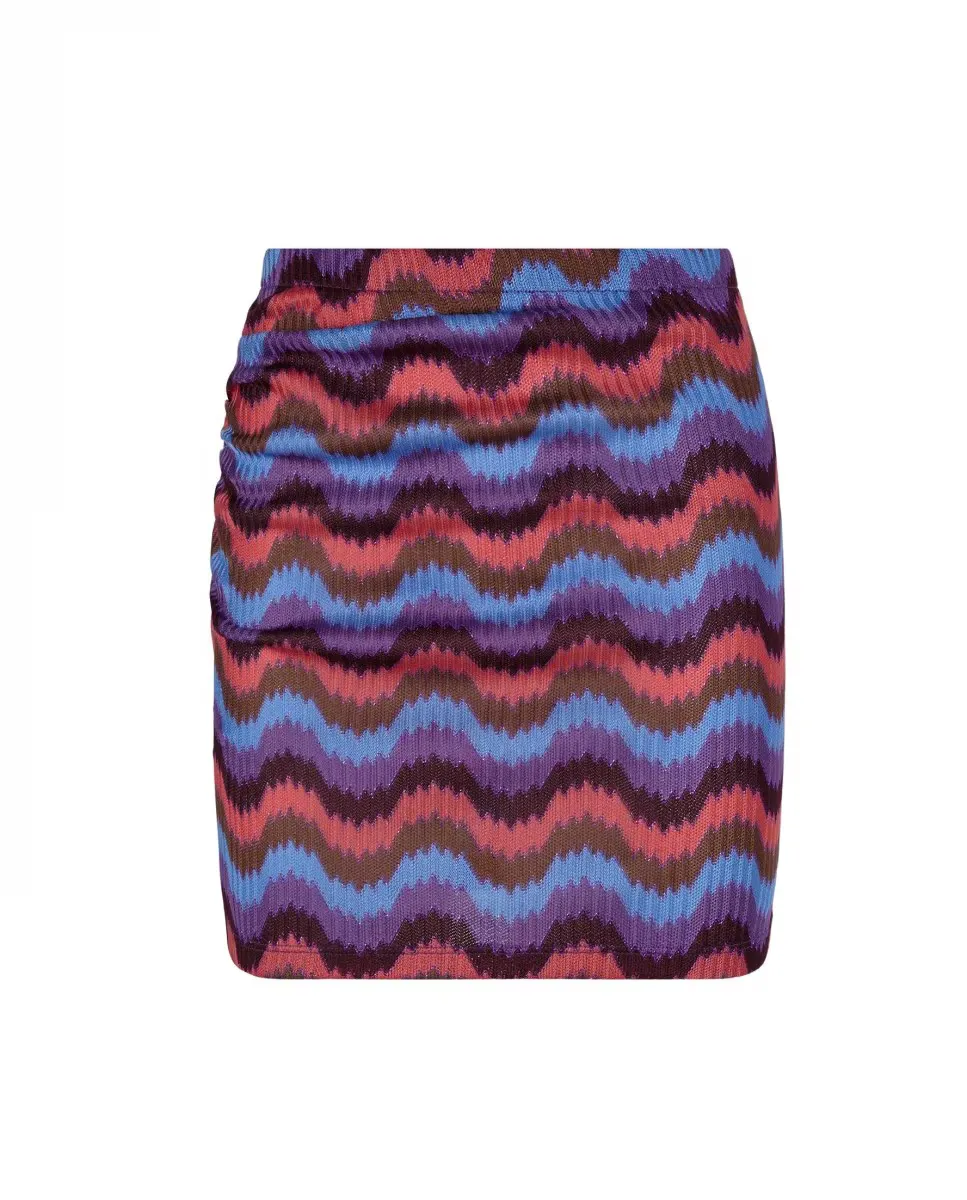 Мини-юбка с регулируемой сборкой сбоку связана крючком с металлизированной нитью и волнистым принтом в фиолетовых тонах. Это универсальный предмет одежды, который идеально сочетается с бикини или с топом, чтобы пойти на ужин в модный ресторан. С резинкой на талии из эластичной ткани для лучшей посадки. На модели размер S/M.